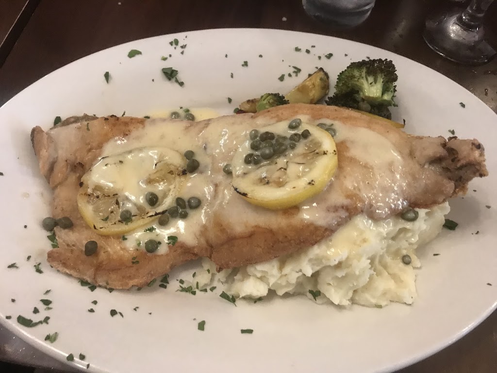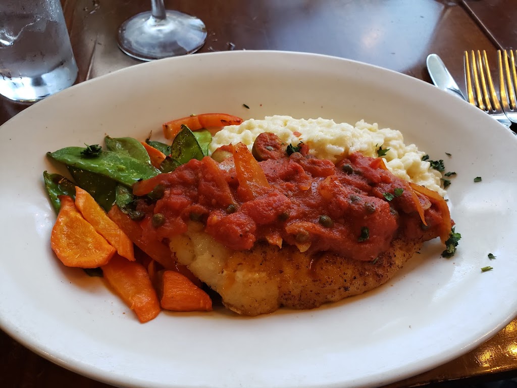 The grilled Romaine Salad topped with grilled salmon was outstanding. Two of us had Chicken Picante fried too long,leaving a hard crust and tough dried out chicken. Neither of us could taste lemon,so we squeezed several lemon wedges ok on it. Also the sauce was too thick, like hollandaise. In 3 years this was the first time we were disappointed in your food.Drinks, wine and Tanquray Martini were very good per usual.