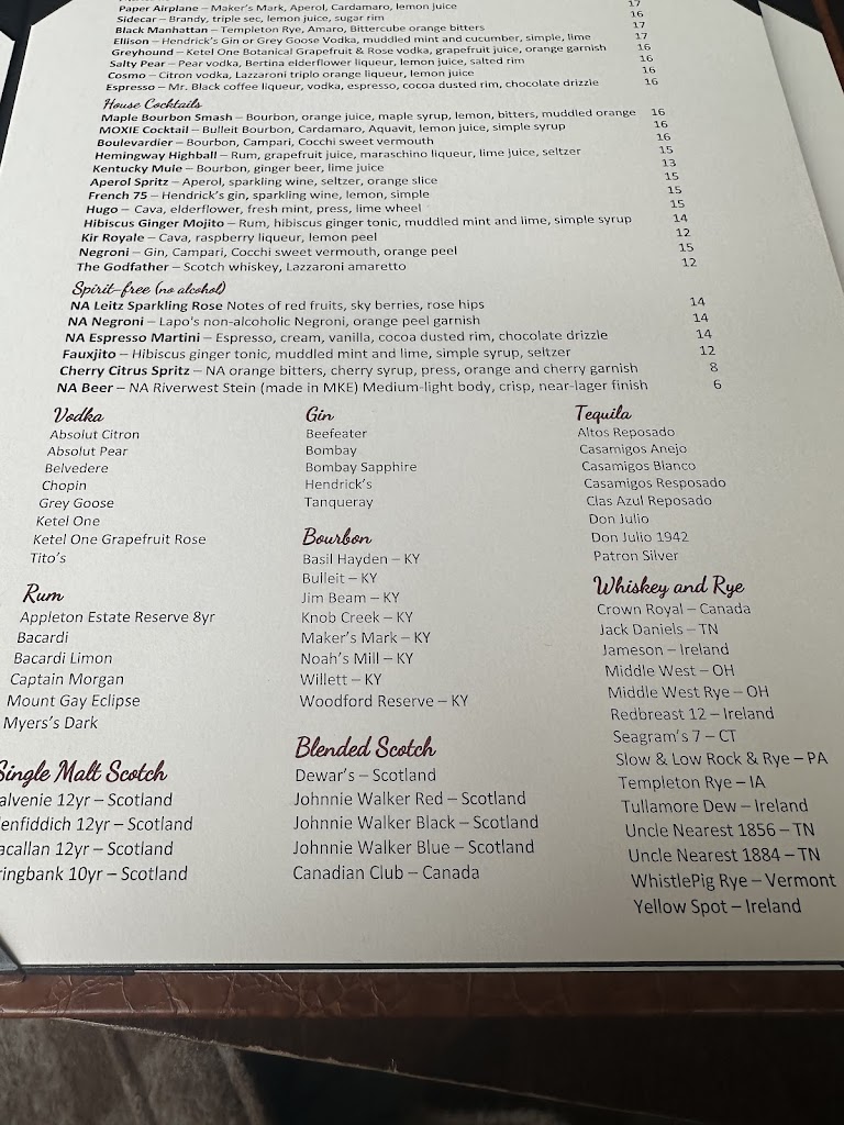 Excellent food and great service in a fun spot in Whitefish Bay. Lived the various choices especially the appetizers and chicken picatta but the dessert was the best great options including Simma’s cheesecake.