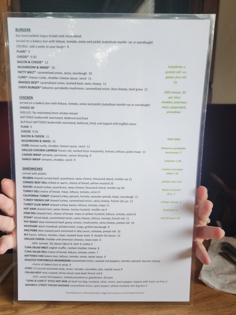 They have daily specials that continually change. And a vast menu including breakfast and lunch items. (I could not decide on one thing to order, so I ordered two sides and three entrees). Taking alot of it home for left overs, and splitting them with my mother. The serving sizes were larger than I expected.