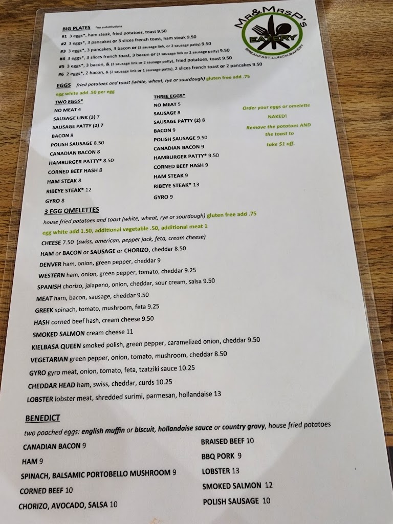 Was heading up north for fall colors and stopped at Mr. And Mrs. P’s for breakfast. Can’t rave enough about this place! The best pork chop I have ever eaten with eggs and hash browns. Kudos to the chef! Don’t drive by this place. Great atmosphere, friendly service and very reasonable prices. It’s a must to add to your list of great restaurants!