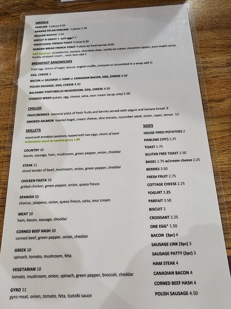 Awsome local establishment featuring breakfast and lunch menus. It's fresh ingredients on the menu sets it apart from the chain grab and go next door and across the street. They do offer take out and have a extensive menu of item s to choose from. You can get breakfast, lunch, or both. We choose both. You can request substitutions and customize your meal to your desires as we did. Great place, great food, great people. Fresh baked goods, cookies, pies, and much more. MUCH, MUCH MORE!I HIGHLY recommend.