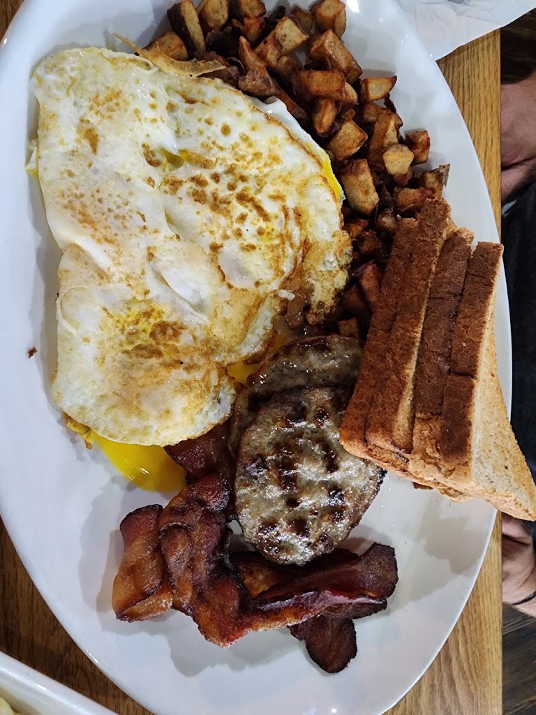 1st time going today, was not impressed at! Meat was super dry the eggs where doused in oil pancakes had dry batter in it still just did not satisfy at all. Meat on pancake plate the links where not cooked all the way and full of oil as well. We didn't even eat a quarter of our plates.