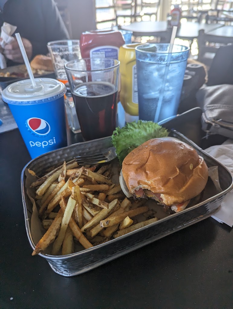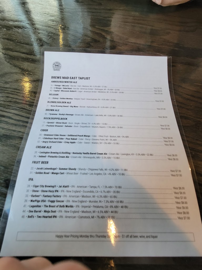 I’ve been here a few times over the years living nearby but never really impressed and always left feeling like I could eat more. For the same price at Red Robin down the block you’d get more food. Folks really only come here for the beer selection and maybe that’s my fault expecting more of the food. The $2 up charge for fries and then you get barely a whole potato of fries is laughable. While no one at the restaurant was smoking the store next door is a tattoo and piercing shop and throughout dinner there was the smell of cigarettes as people came in and out of the tattoo shop. The pickle chips appetizer was good and thankfully everyone else was occupied by their meals that I was able to finish the app off.