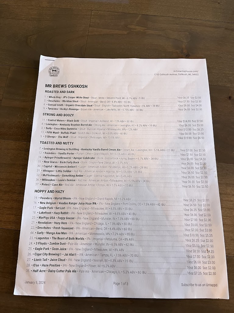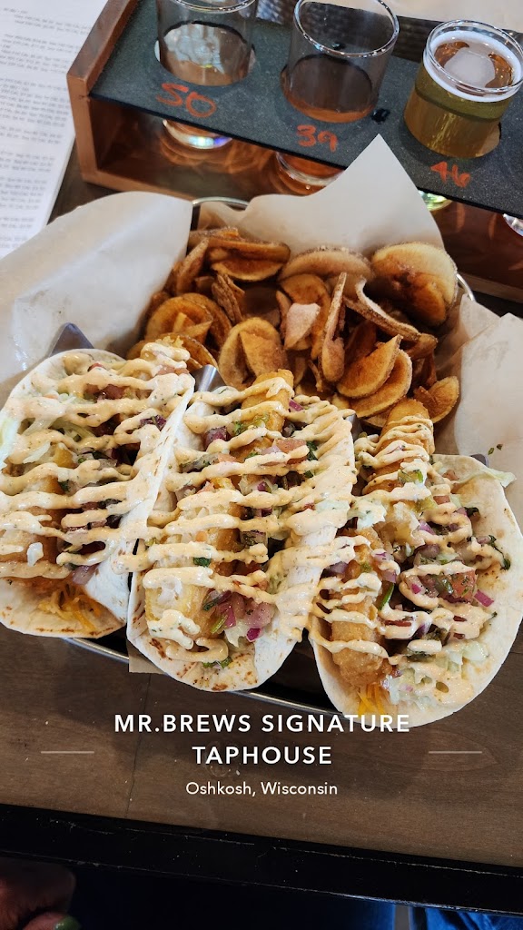I recently had the pleasure of dining at Mr Brews Taphouse in Oshkosh and I must say, it was an outstanding experience. The restaurant boasts a warm and inviting ambiance that is perfect for a night out with friends or a cozy dinner with a loved one. The menu offers a wide variety of dishes, and the food was simply delicious. From the appetizers to the entrees and desserts, everything was cooked to perfection and bursting with flavor. The service was excellent as well - the staff was attentive, friendly, and knowledgeable about the menu. Overall, I highly recommend Mr Brews Taphouse in Oshkosh and would definitely give it a 5-star rating for its amazing food, top-notch service, and welcoming atmosphere. (Not pictured, cheese curds were delicious and I forgot to take a photo before consuming.)