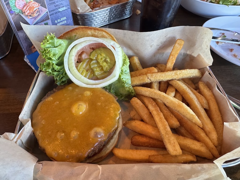 We wanted a burger but needed a place that allowed dogs, since we were on the road with ours. We sat on the patio with him, and they even brought him a water bowl. Plenty to choose from on the menu, including your burger as a salad bowl. Food was quick and tasty, bathrooms were very clean, and staff was very friendly. Will definitely come here again.