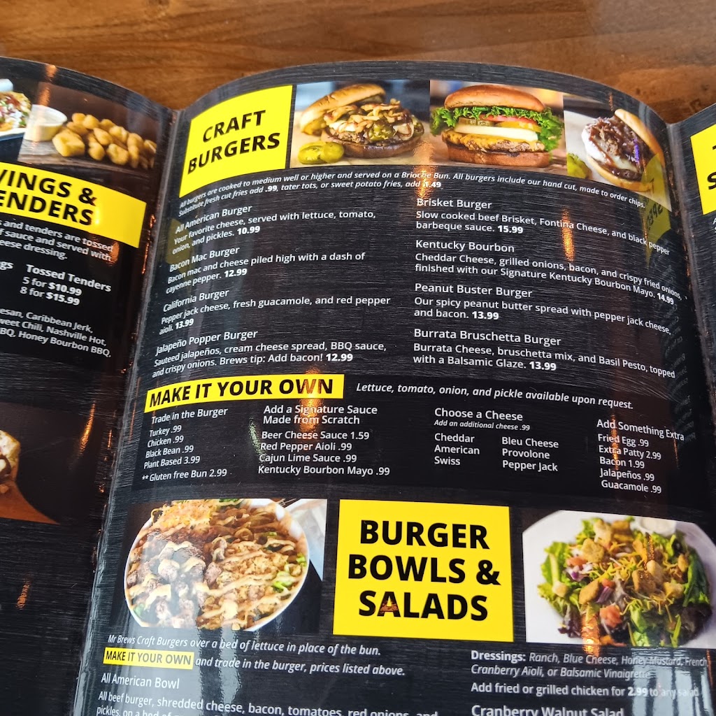 My wife and I visited Mr Brews as we were recommended to go there from a waitress who works at both Brews and Buffalo Wild Wings. She had mentioned that Mr Brews was by far the better restaurant. Our visit begs to differ actually as what we ordered was both raw and over cooked, actually burnt. I ordered the bacon Mac burger with fries. My wife ordered the chicken tenders basket with house chips. We also had fried cheese curds as an appetizer and we should have stopped with the appetizer as it was the best item on the menu we have tried so far! That said, my burger had Raw bacon meat and the bun was both over cooked and cold at the same time. How is that even possible? The meat was dry and had a very weird taste, maybe the undercooked bacon meat? My wife's chicken tenders were absolutely tasteless if that's possible because the chips and chicken and the French fries all tasted like the fryer oil was old and was needing to be changed from the night before. We had high hopes for this burger joint but we probably will never go back from how we were treated by the manager on Saturdays 11am visit. Don't get me wrong our waitress was awesome she was attentive understanding and she did all she could to make it right. That was great. But her manager not so much. He did offer a kind of apology for the way the food turned out. But gave us both very weird looks as if we didn't know what we were talking about. Trust me I know food and I know how it should taste and be prepared as well as how food tastes and looks when the fryer oil is old used up and burnt. He did comp my complete meal which was nice. But he gave my wife a weird look when she said that her chips tasted burnt, which they did! So he offered to make an extra batch of fries to take home with the two chicken tenders that she did not finish and the rest of the few french fries that were left for my meal. we agreed that would be nice. But when we got the bill he actually charged us without mentioning 99 cents for these 10 extra french fries. By the way if you think you're going to this restaurant and thinking that you're going to get a decent amount of food, you are wrong. For what you pay and for what you get you're better off going to a fast food joint. Now I do not doubt that if you go to this establishment with drinking and having grub and that was your highest expectation, then yes that's what you will get. However if you go expecting to have high quality meals with service you may want to explore going to a different restaurant.