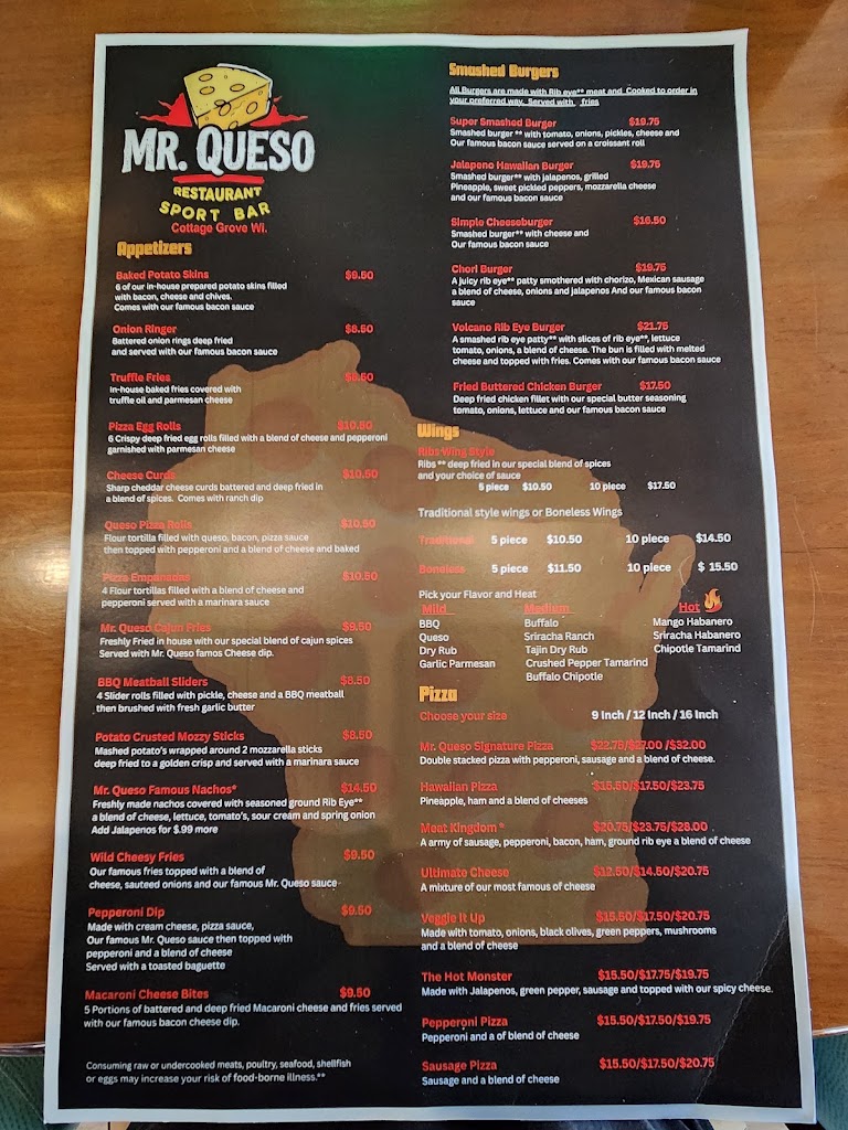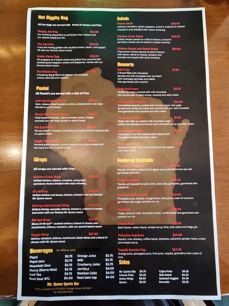 My boyfriend and I went for dinner at Mr Queso's Saturday of Labor Day weekend and unfortunately the place was empty, we were the only ones there. However, the whole experience was fantastic. Our waiter was great, his attitude and energy made the night even better. I had 2 small Hawaiian Margaritas and my boyfriend just a regular margaritas. The drinks were great, the didn't taste strong, but I can tell you they didn't skimp on the tequila. We had the chicken empanadas, they were a little dark, but everything was freshly made not frozen, the crema was very tasty, you could tell the pico de gallo was fresh as well. Lastly I had a burger and fries. The burger was made out of ribeye and was cooked exactly as asked, very well seasoned and the bacon sauce is great, I had mine on the side for my fries as well. My boyfriend had the smash burger tacos, the ribeye the use again was well seasoned and cooked. The tacos were full of filling and he was very happy. Both meals were served with fries. I think next time if I do an appetizer I will skip on fries, everything is just filling so I would do one or the other. We had to try the Flaming Peach Dream for dessert, great was to end the night. Not overly sweet and the brandy sauce and the peach pair very well together. If i had to mention negatives the menu is very large so lots of options almost too many and prices are on the higher end, but for example the burgers are made of Ribeye meat. So, not your everyday ground hamburger. This is a higher end quality Mexican Sports bar not just a standard chips and salsa Mexican Restaurant. I highly recommend.