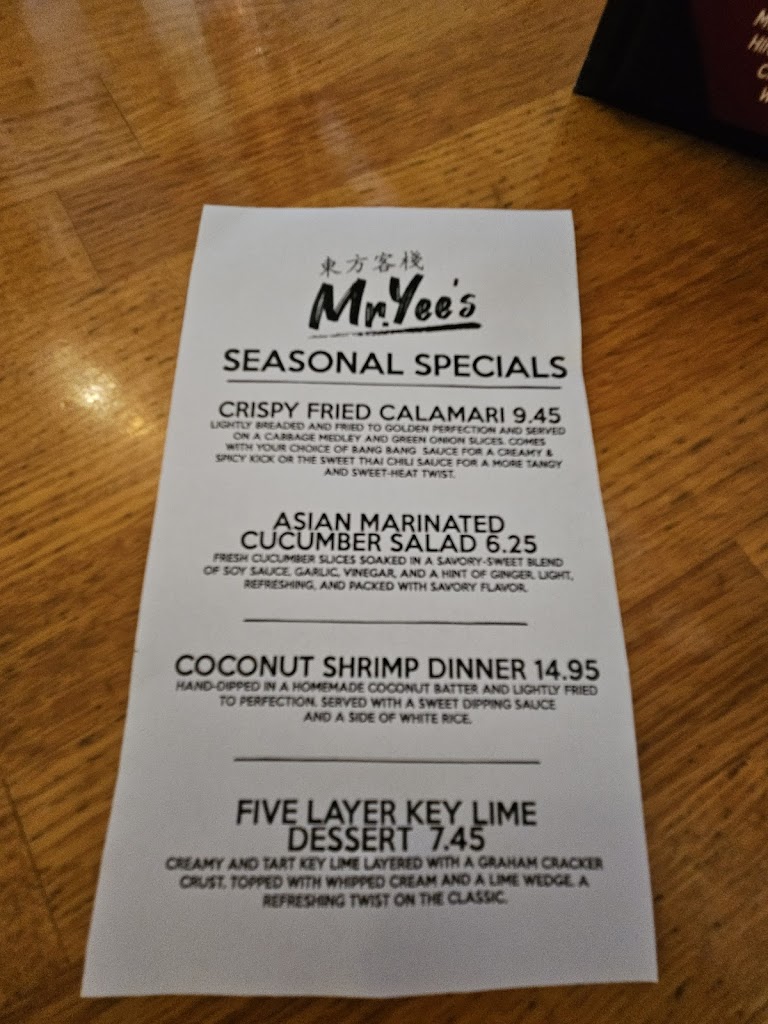 First time in since new management. 40 years of dining here with my wife. We've gotten the same meals everytime 😋. It's not Yee's but we'll be back.