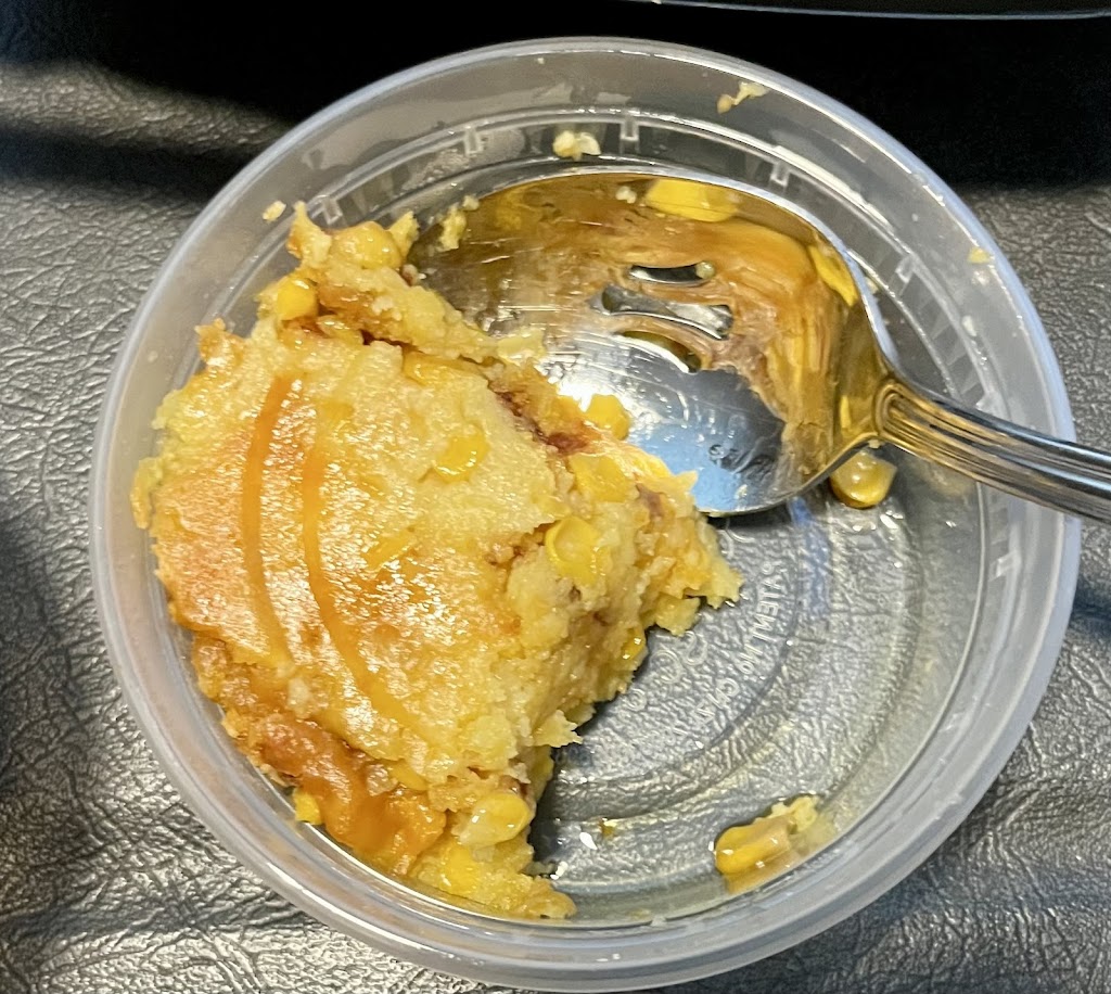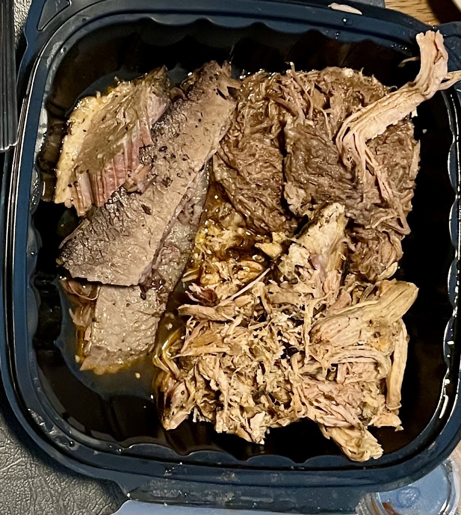 My husband had the beef brisket and homemade chips. He was very pleased with his pick, enjoying the pickle as well. I had the two meat dishes (pulled pork and beef brisket) both excellent! My side dishes were the corn casserole (Thanksgiving quality) and coleslaw which was fair.