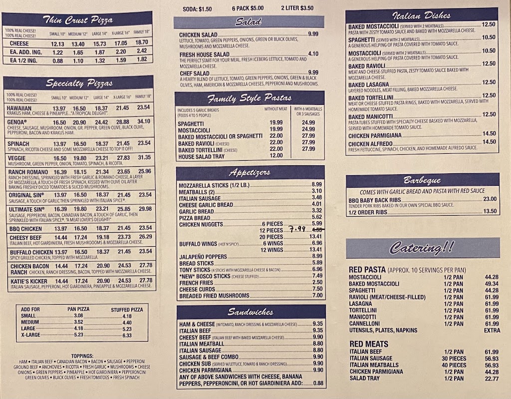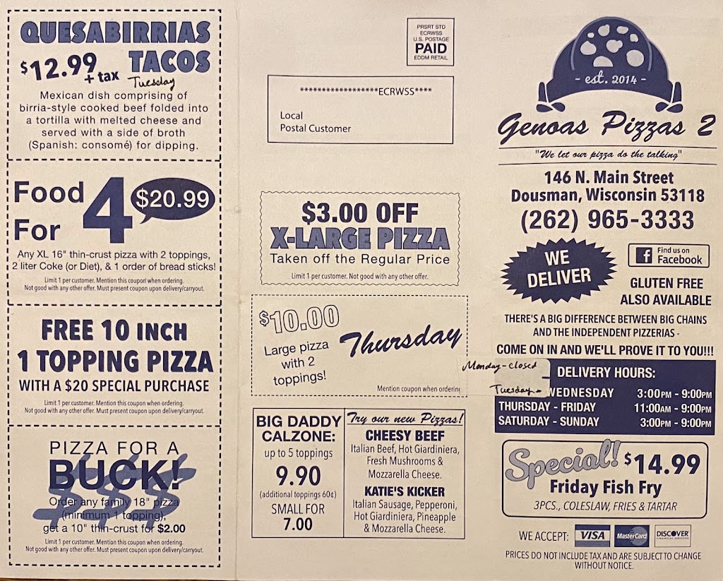 Horrible service. Tried to order 18 in pep and saus pizza with 1/4 of pizza plain cheese for kids. Offered to pay full price and was told rather rudely that they couldn’t do that for me. Willing to pay more than what the pizza was worth but noooooo. Called pizza guy in Wales and they were happy to take my money and give me what I want. Just moved to Dousman and won’t ever order from this place.
