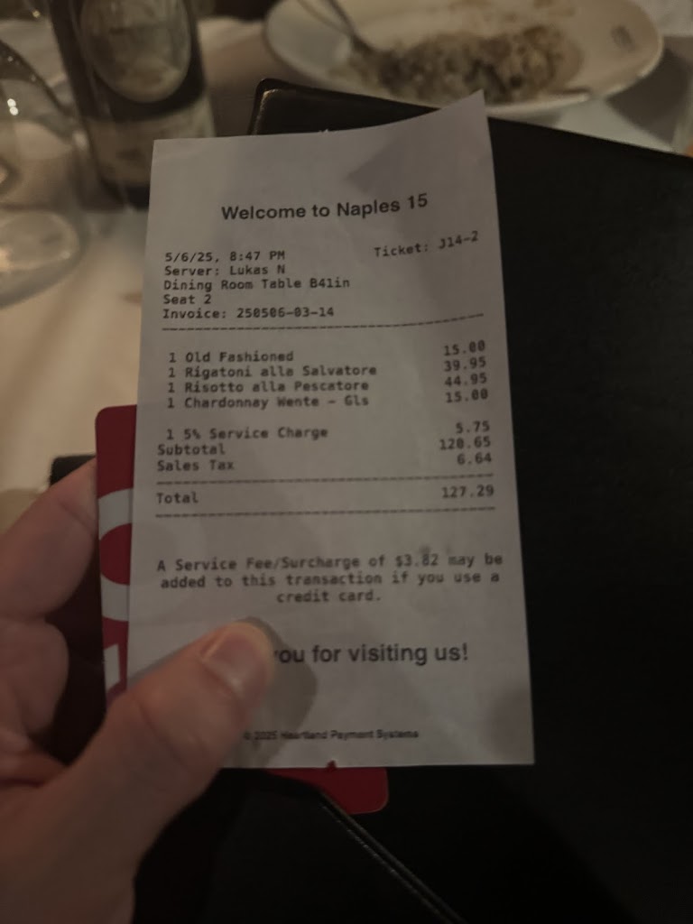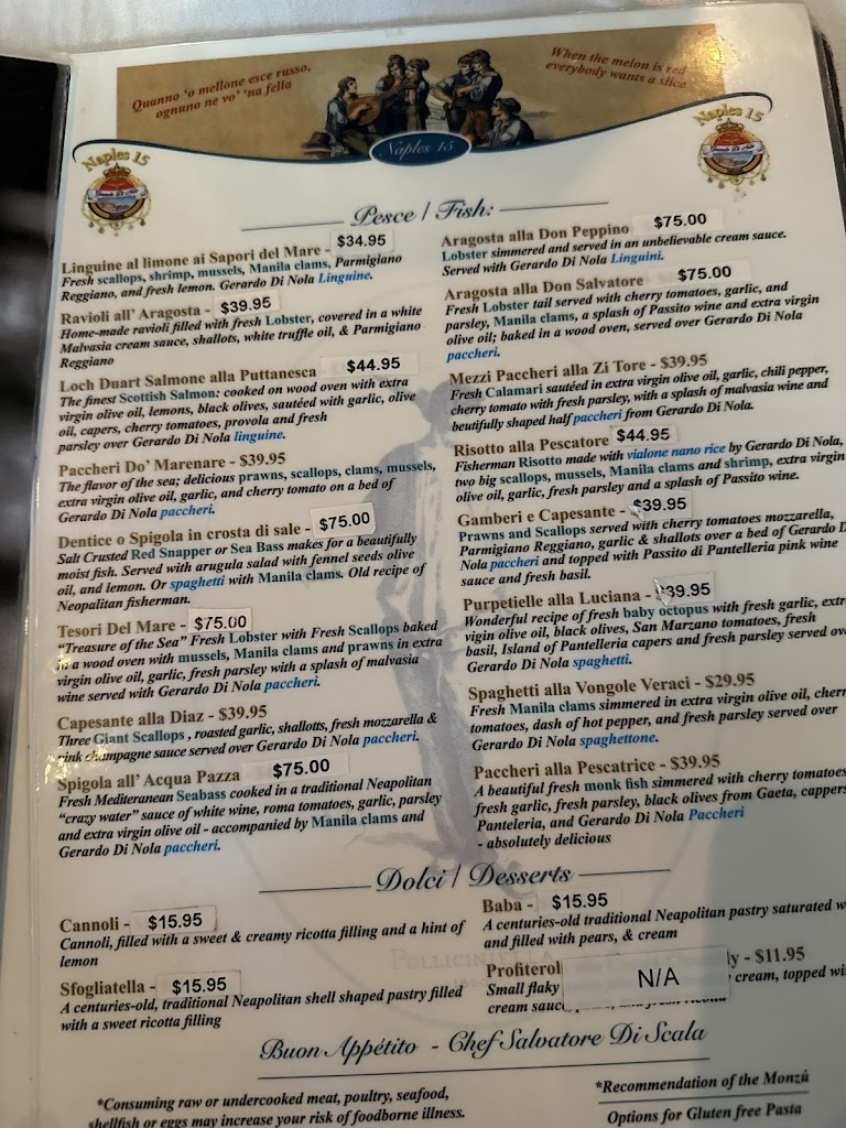 I’ve dined at Naples 15 twice, and I wouldn’t recommend it for large parties. Maybe it works better for a date night. But for groups, the experience is frustrating and overpriced.
