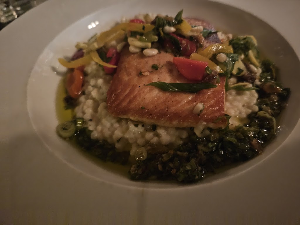 We were with friends. The wine and cocktails were great. My wife and I shared a steak pizzaiola and we each subbed a Riverwege salad. It was sooo good!