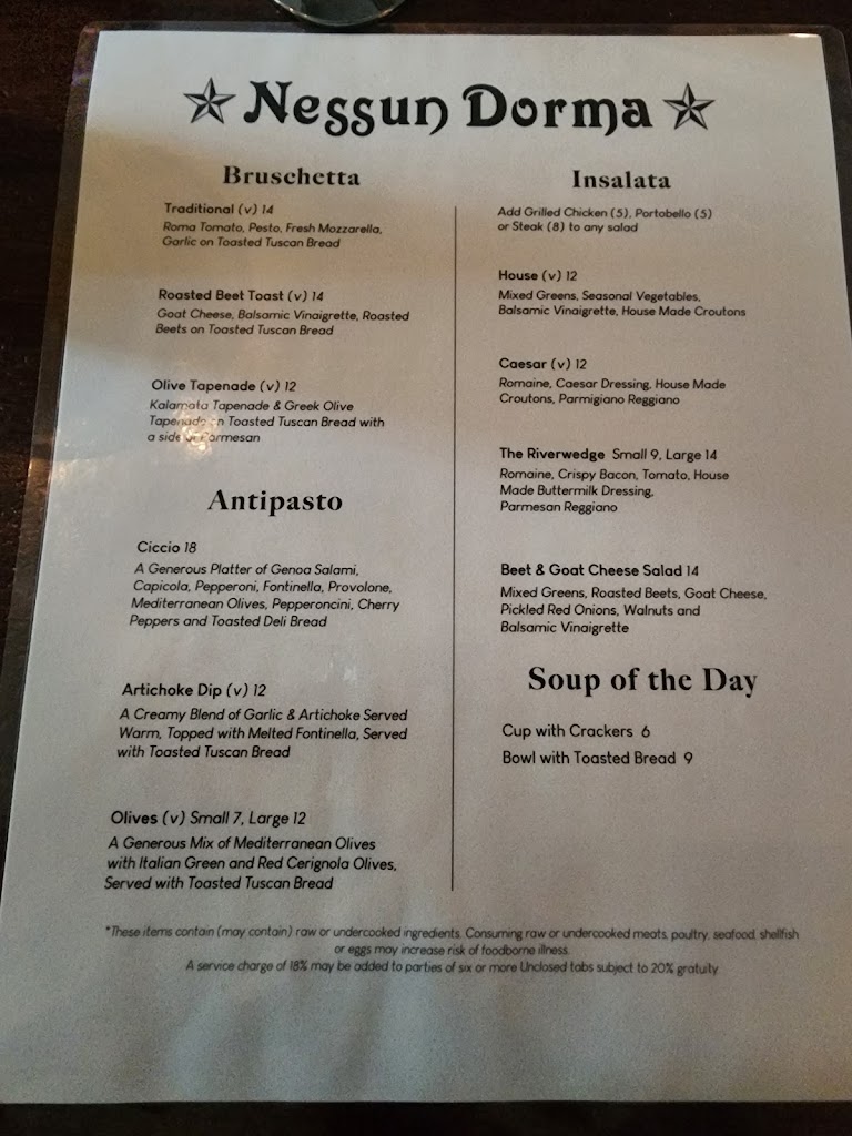 Nessun Dorma is one of my favorite restaurants in the Milwaukee area. The Spinach Artichoke Dip is a must. I dream about it (lol). My go-to is the Spicy Steak Sandwich! The Riverwedge salad is also pretty tasty. Cozy and cute. You can't go wrong!