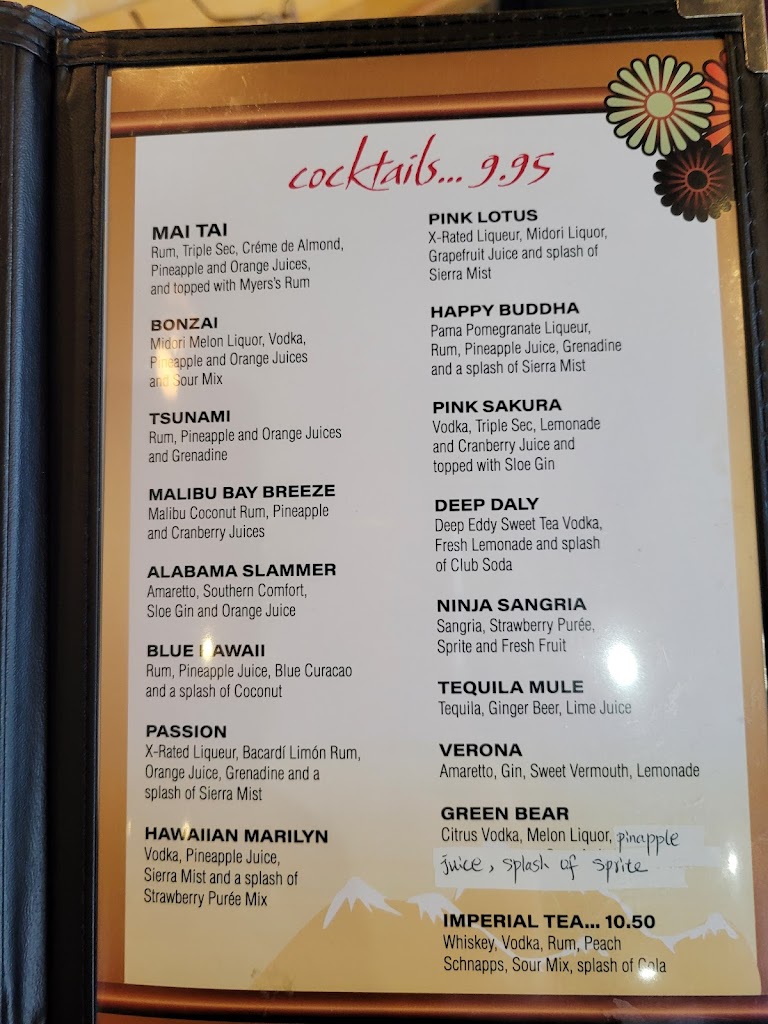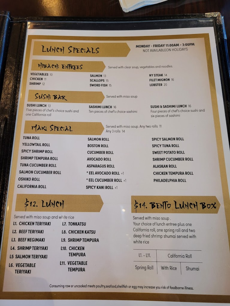 The food was amazing!! We ordered hibachi, and the cook put on a great show! Cooked us a delicious meal that we were able to even finish the next day. Awesome portion sizes!