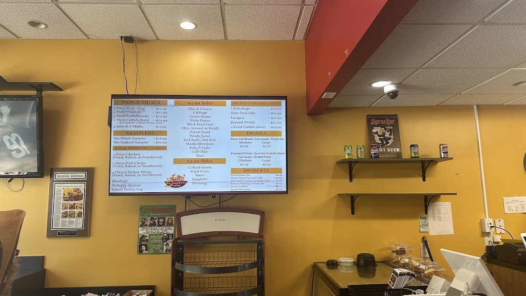 Im a traveling foodie that had high hopes for this small soul food joint in a nice neighborhood in a Milwaukee suburb. It appears to be black owned. Seating is very limited and you choose your own. The gentleman behind the counter might have been the owner and was very friendly with everyone. The digital menu was easy to read with many of the typical "southern" choices. I went with the sampler of catfish, porkchop and a wing. There were only 2 customers ahead of me in the store. Customers were a combination of DoorDash and walkins for take-out. My sampler took OVER AN HOUR! I was about to ask for a refund and walk out. Others were frustrated as well. I saw one customer cancel his order and leave.