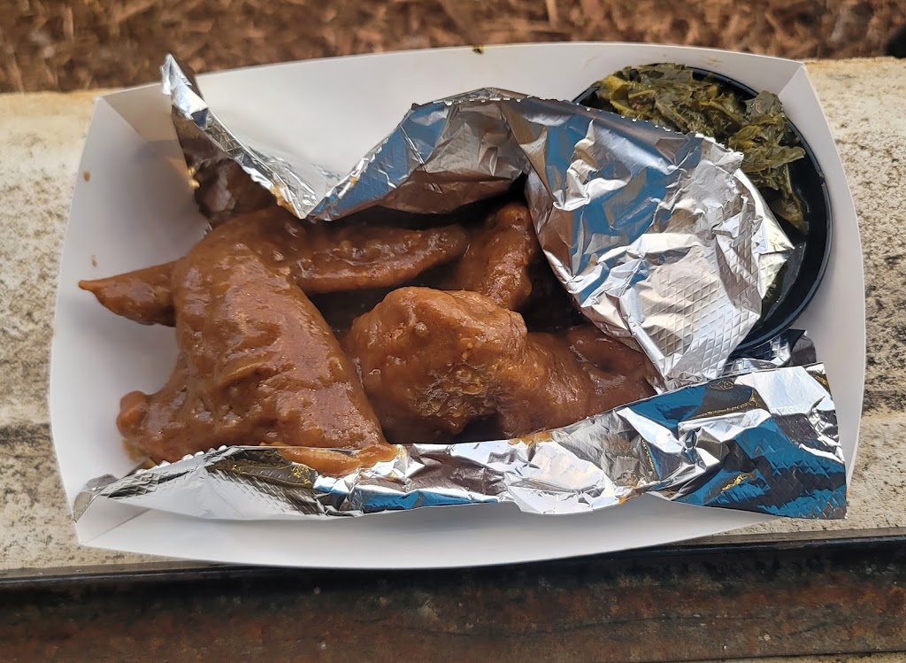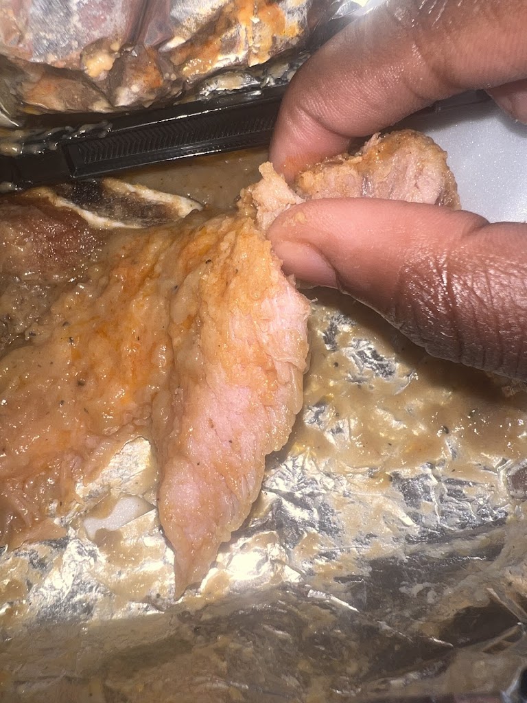 Ordered smothered wings rice and dressing. The gravy was too salty. Lighten up on the salt and it will be perfect. The porkchops were too tuff and your greens needed some onion and chicken broth.