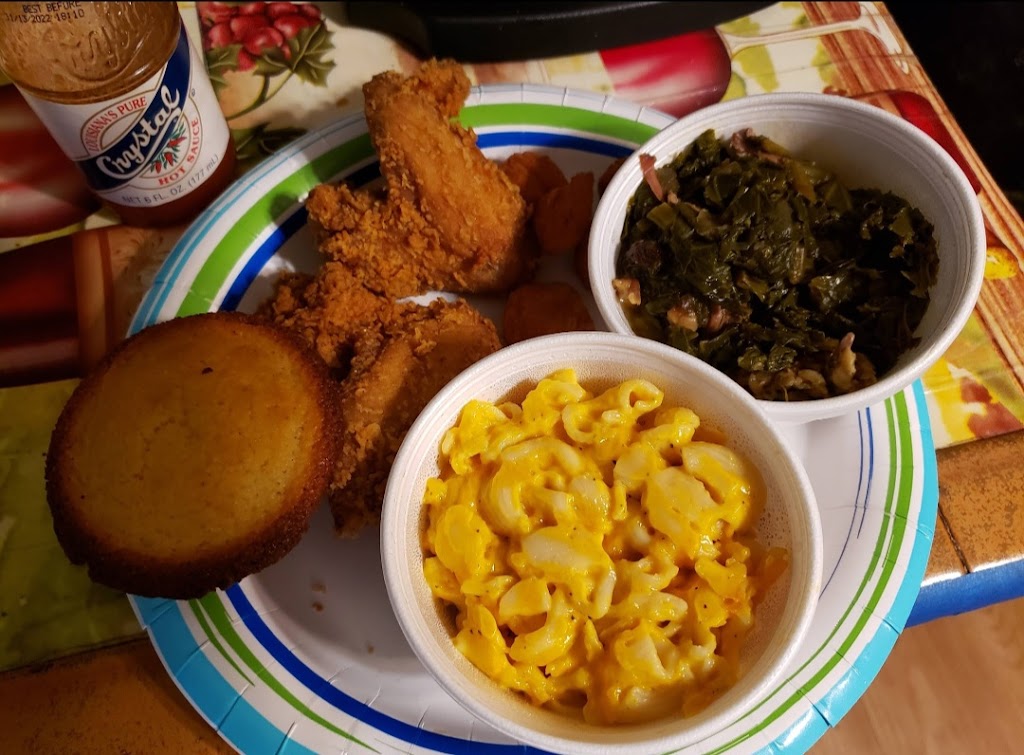 Fish fried in burnt grease smothered wings were overcooked green beans overcooked the only thing worth buying in the Mac n cheese and the grape kool aid don’t waste your money this was horrible