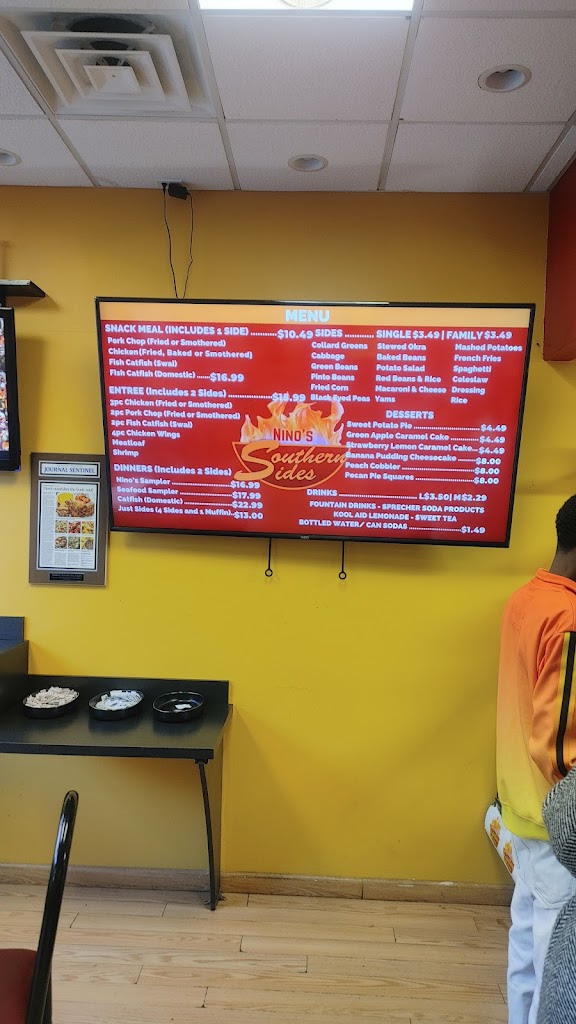 My husband and I tried Nino's for the first time last night and WOW! Our dinners were FANTASTIC! We both had fried chicken. Sides were collards, spaghetti, mac and cheese and stuffing with gravy. Everything was very tasty. And the portion sizes were a great plenty. Also included was a side of cranberry sauce and a corn bread muffin. We gobbled everything down so quickly, there was no getting a picture!