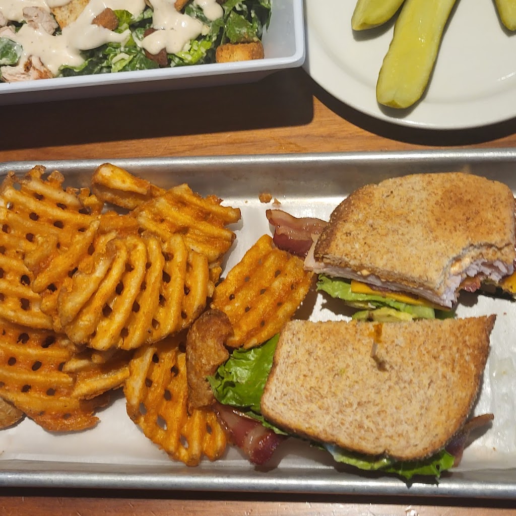 The food was... Different. My friend got the Caesar salad and the dressing was nothing to write home about. It wasn't fresh and zesty. It was like a cheap off-brand of dressing. I got the turkey avocado bacon sandwich and the turkey was very over processed and almost to the color of ham with a very soft and almost slimy texture that did not pair well with the toasted multigrain bread. I got it with cheddar cheese instead of Swiss and the whole flavor and texture combination did not pair well. The seasoned waffle fries were great though. So were the pickles.
