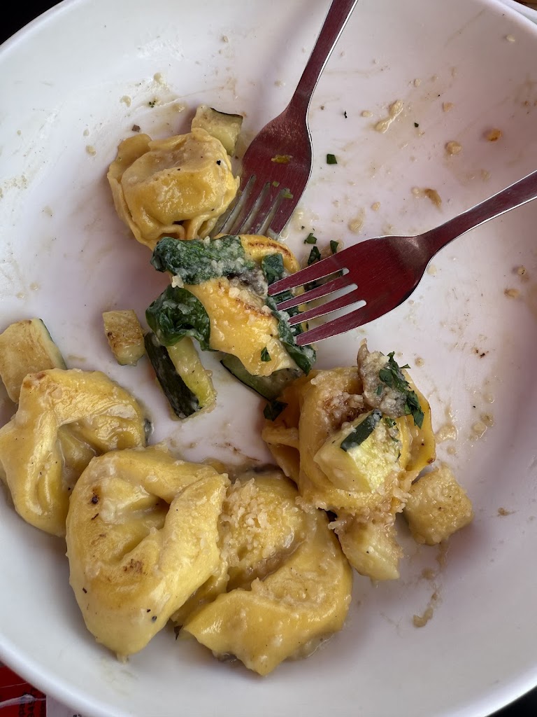 Good Food! Tortellini noodles w/chicken in Alfredo sauce, Rosa pasta (red sauce), garlic bread, zucchini pastas too are all good!