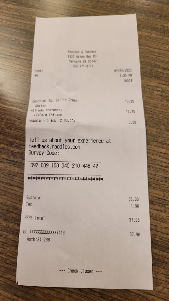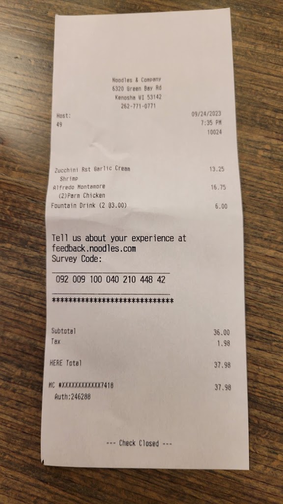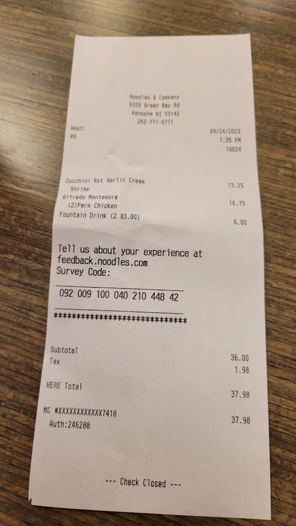 Been to Noodles quite a few time and always get the same thing (steak stroganoff). Last night at the kenosha green bay rd location I wasn't a fan. Probably should have sent it back but I was too tired and hungry to deal with it. Noodles over cooked and pasty.