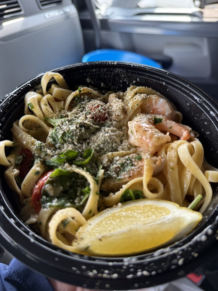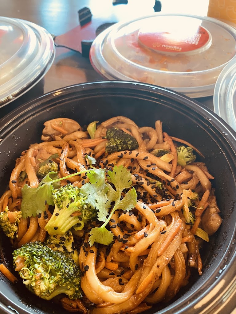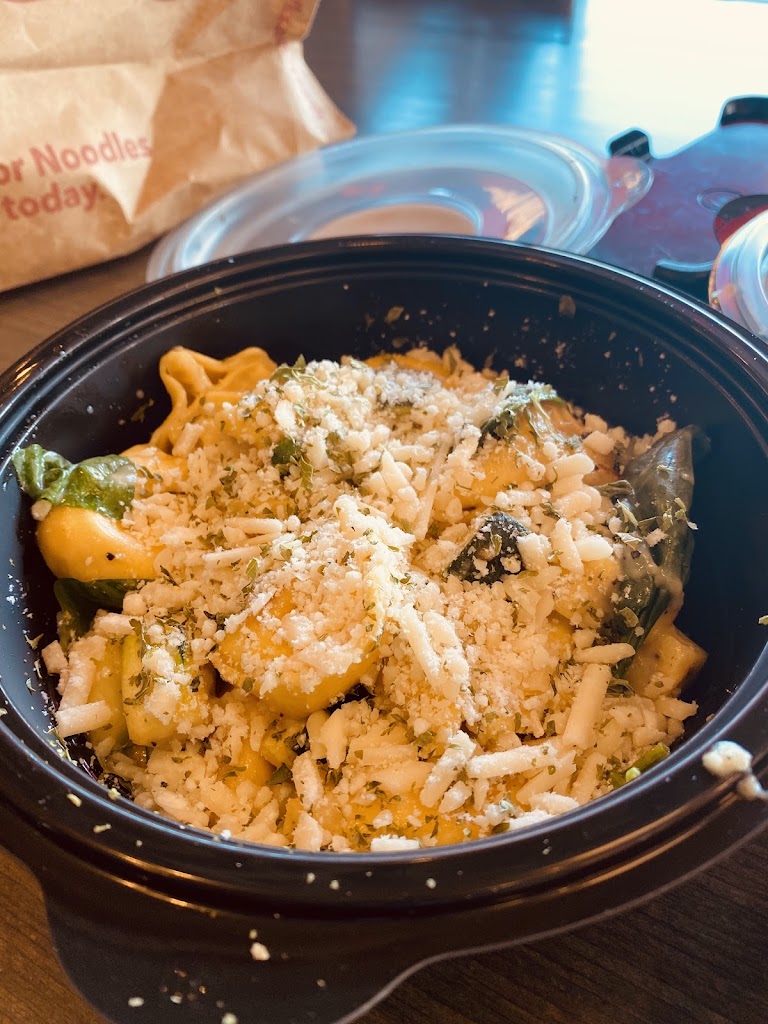 I ordered the Alfredo MontAmoré and potstickers. Loved the pot stickers I get them every time I get noodles, but my Alfredo was was a little disappointing I had the smallest piece of chicken and my spaghetti was on top of everything else not put together. As I was eating I found I chuck of noodles stuck together.