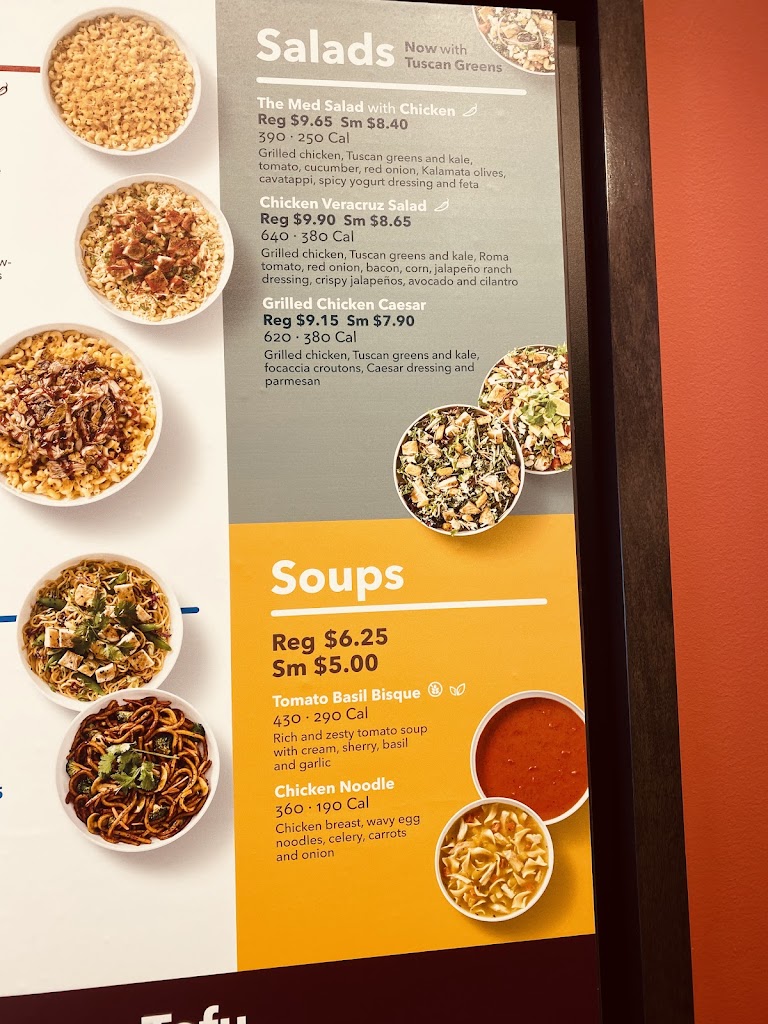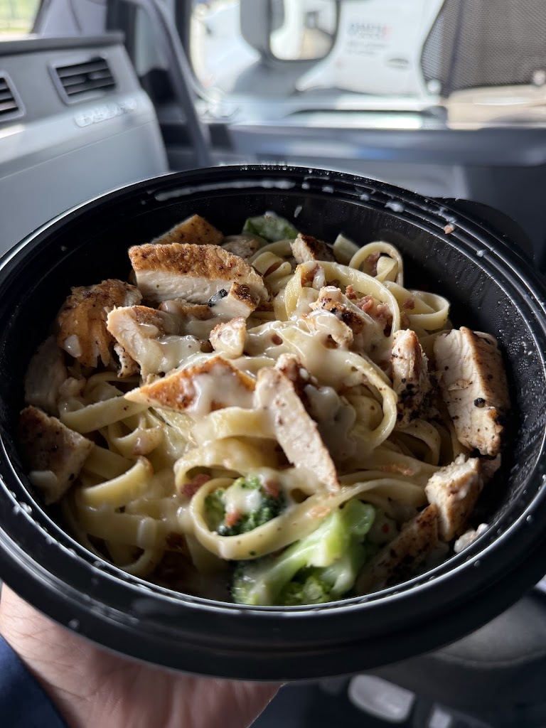 Always get the same thing. The last couple of times, have been a disappointment. Got the Mac and cheese, broccoli, and chicken. Hardly any cheese, broccoli was a couple of specks of green no real pieces of broccoli and you pay extra for that.