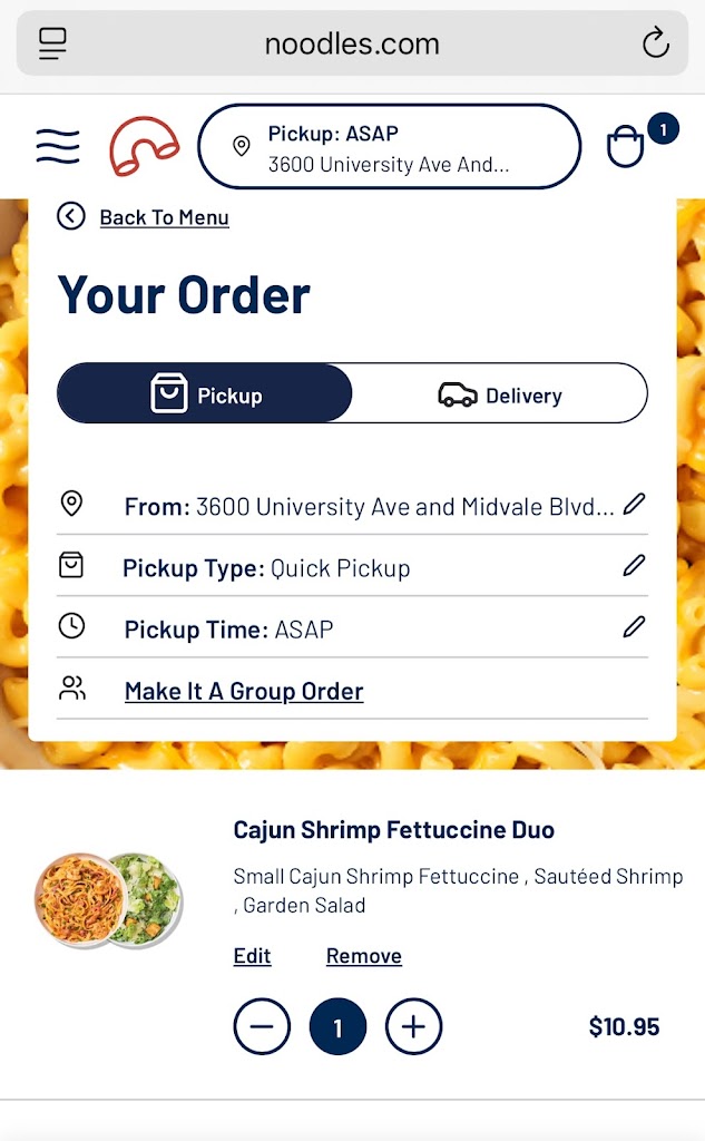 I had ordered through the app which uses door dash for deliveries, unfortunately one of the door dashers said they were me and took off with my food! I called noodles and Dwight was so kind and understanding of the situation (I work at a hospital and have times 30 min breaks) he was willing to personally deliver the remade food to my location! Great customer service and will continue to come for my noodles!