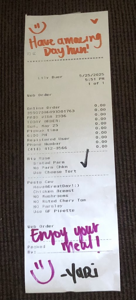 Noodles and company have been a favorite of mine ever since I was a kid. Despite developing a gluten allergy, they have remained one of the few places I can get food from. On 5/25/25, I placed an online order for dinner and didn’t think much of it. After working a 12-hour shift, I needed some good food to help me unwind from the day. I sent my boyfriend to pick up the order, and on the ticket, there was the sweetest message I have ever gotten written on it. I cried once reading the message. Thank you for the kind words, Yari. Your kindness has made me beyond happy and I hope you know how impactful your message was. I hope every establishment hires more people like Yari. Thanks again, it made me smile. :)