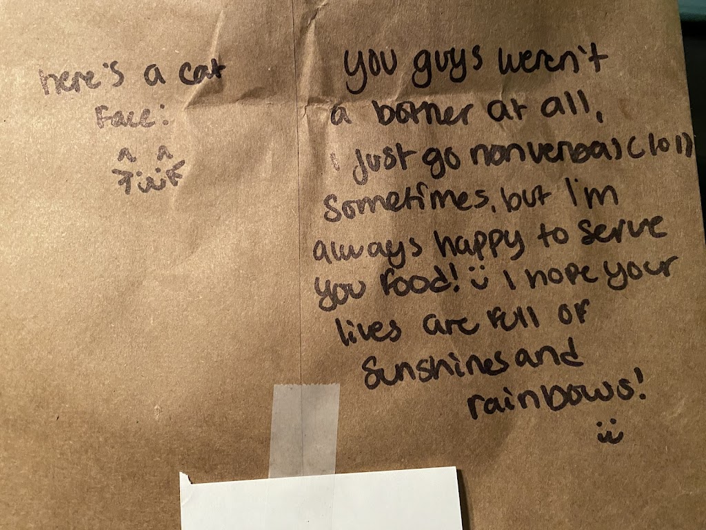 We walked in 15 minutes to close and apologized for being those people. We try not to do that to people but we just /really/ had a crazing for Noodles and Co last night. The cashier opened their mouth as if to say something, paused, shut it, and just shrugged at us with an apologetic smile. We apologized again and stepped away to wait for our food. When it did arrive it has this lovely note. The cashier was so lovely! I wish I knew their name! Managers, if you read this and know who closed the night of Sept 30th they were lovely!