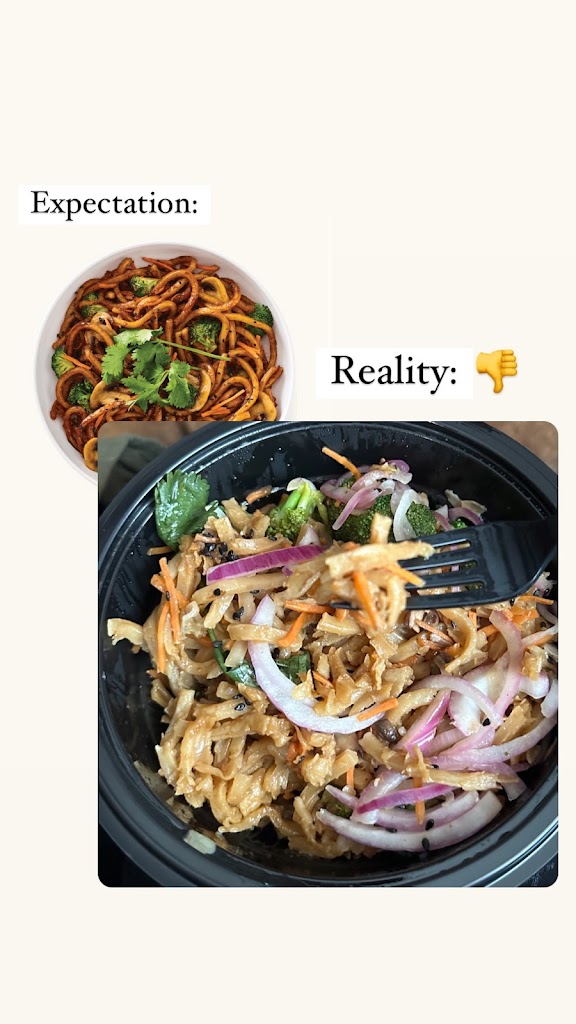 I’ve ordered delivery from this location a couple times, and was shocked by the poor quality. Cold, hard, dense tofu, overcooked, mushy noodles, customizations not followed, sauce forgotten completely. I waited a year and thought I’d try again, but the photo speaks for itself. The sauce was forgotten completely, there was only some sort of oil coating on the noodles, the noodles have been reduced to mealy bits, and the veggie customization wasn’t followed. I give up!