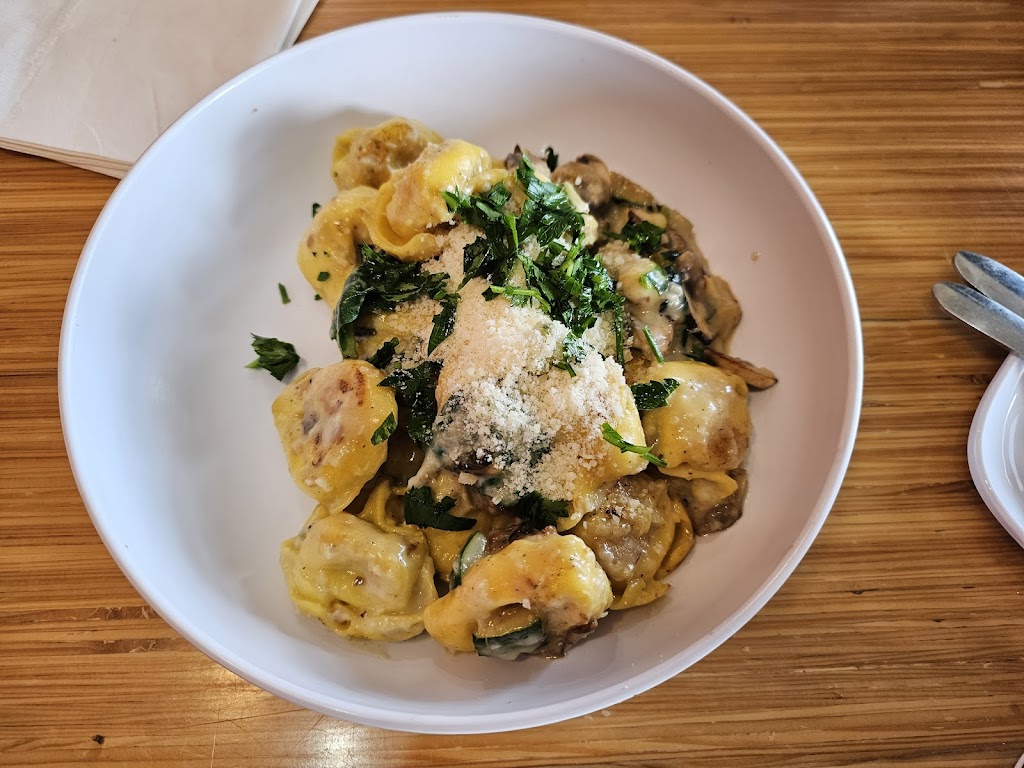 I had the cajun shrimp pasta, and it was good. My husband had the creamy garlic tortellini, and it was good. Friendly service.