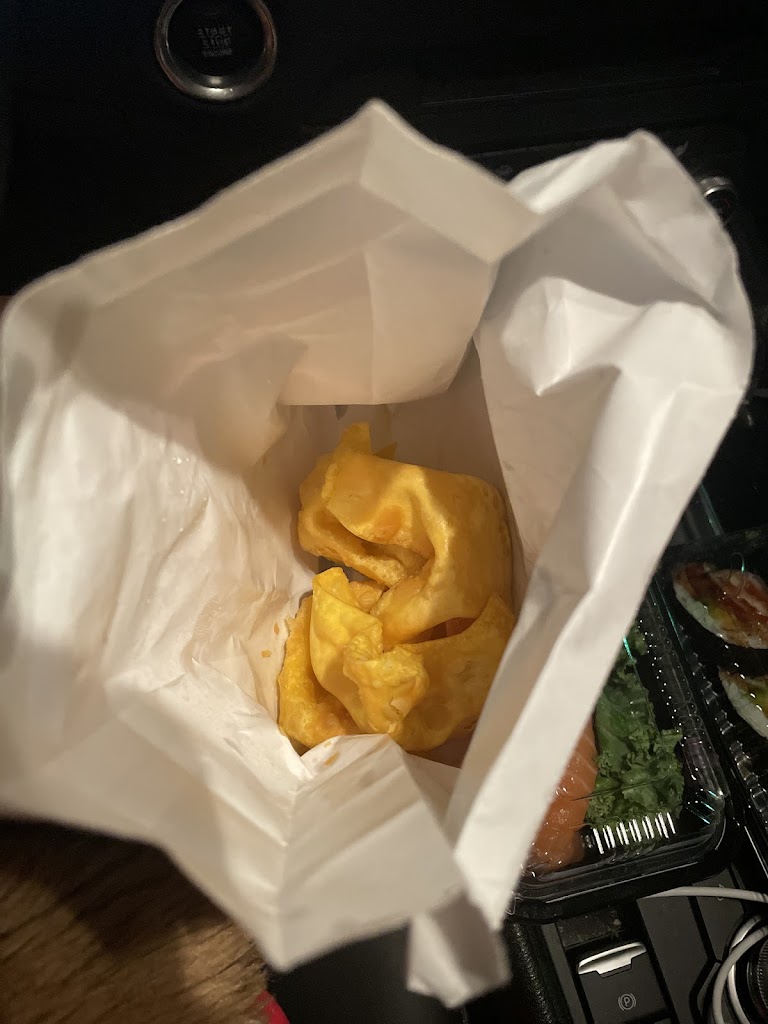 This place has great sushi and crab rangoon! I walked in and was greeted very nicely. The place is not very busy, getting a lot more delivery orders than in person orders. I was very quickly given my food.