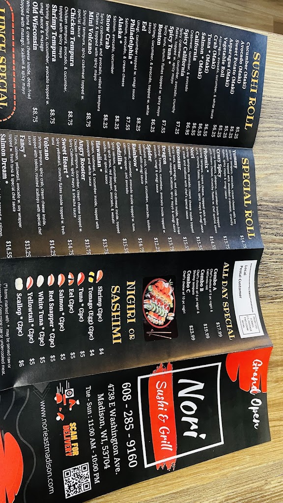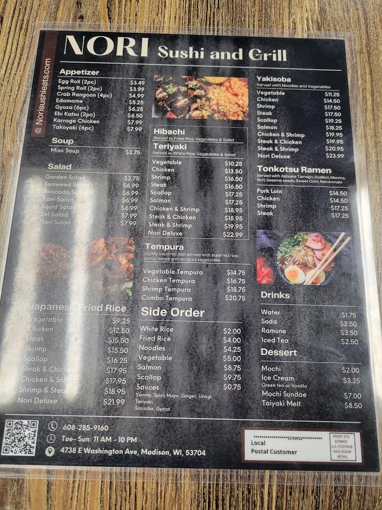 Nori Sushi and Grill focus on serving the community with freshly prepared authentic sushi and hibachi. Our unique assortment of sushi roll allows everyone to find something to enjoy. From raw fish to fully cooked rolls, the possibility are endless. In addition, our grill offers savory hibachi, teriyaki, yakisoba noodles, and more. Our teams mission is to deliver a modern taste of Japan and share this love of country through cookery.