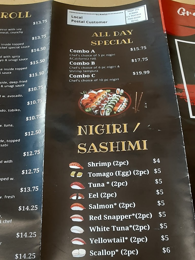 Received their menu in the mail thought I would give it a try I’m not much of a sushi had the vegetable one very good and refreshing would go back again great staff friendly service