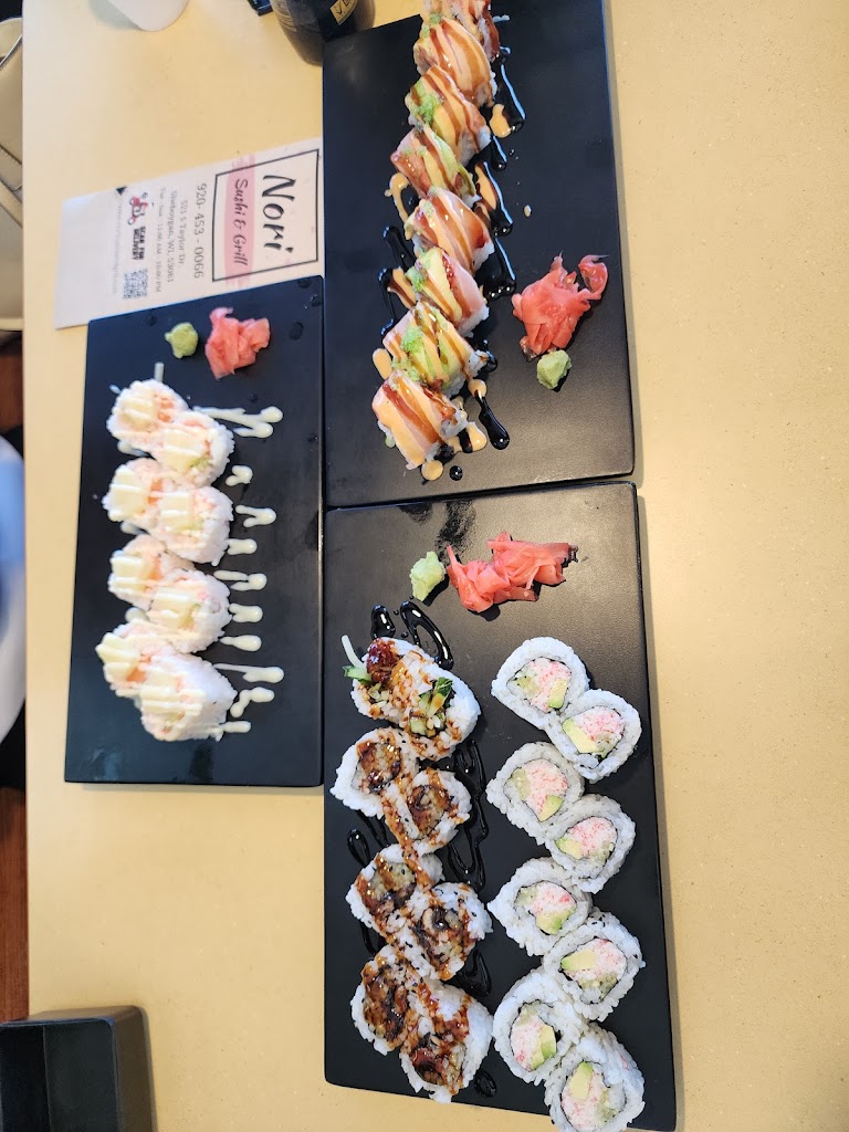 I have ordered from Nori several times , always with great success. Today, i picked up my usual order consisting of a wisconsin roll and a shrimp tempora roll...both of which were not up to their usual high quality standards. I called, and they were kind enough to replace the order as well as give me a gift card for my trouble. Thank you so much Nori! I look forward to seeing you again!