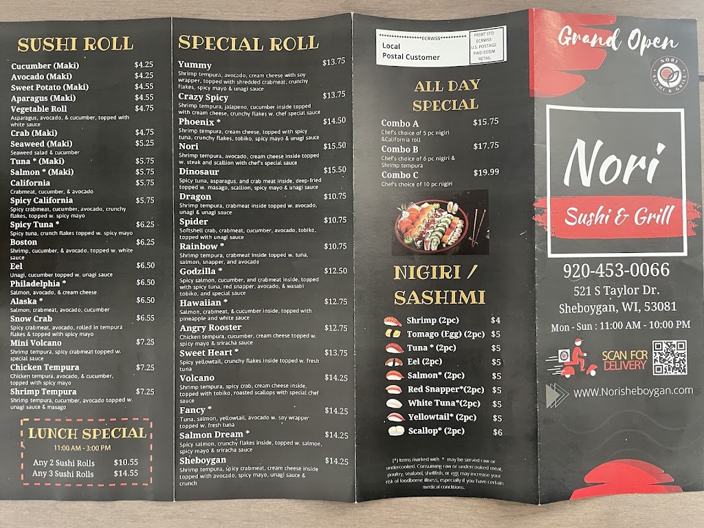 They just opened so I wasn’t expecting it to be THAT good, but was pleasantly surprised. Located in the old Cousins subs in the Taylor shopping center, the location and seating is just so-so, but the service and food was EXCELLENT. I have never seen takoyaki offered as an appetizer and the flavor took me back to when I lived in Japan, it was spot on, delicious! I had the Nori specialty roll and it was sooo good! I never had steak on a sushi roll before but they knock it out of the park with flavor and texture, can see why they named it the Nori roll. The service was great, grab a menu from the front or order at the register if you know what you want. The man working the register was super friendly and they got the order right, brought it to the table when it was ready (got it to go, the seats are a little too hard for having physical issues). So while the inside is a bit lacking in comfort, the food and people more than make up for it. I will definitely be a return customer (and it looks as though they have a loyalty program, good news for me). It’s a must, especially given that they deliver (not an option at our only other sushi place). Thank you so much for coming to Sheboygan, Nori Sushi and Grill! I wish you great success, kanpai!