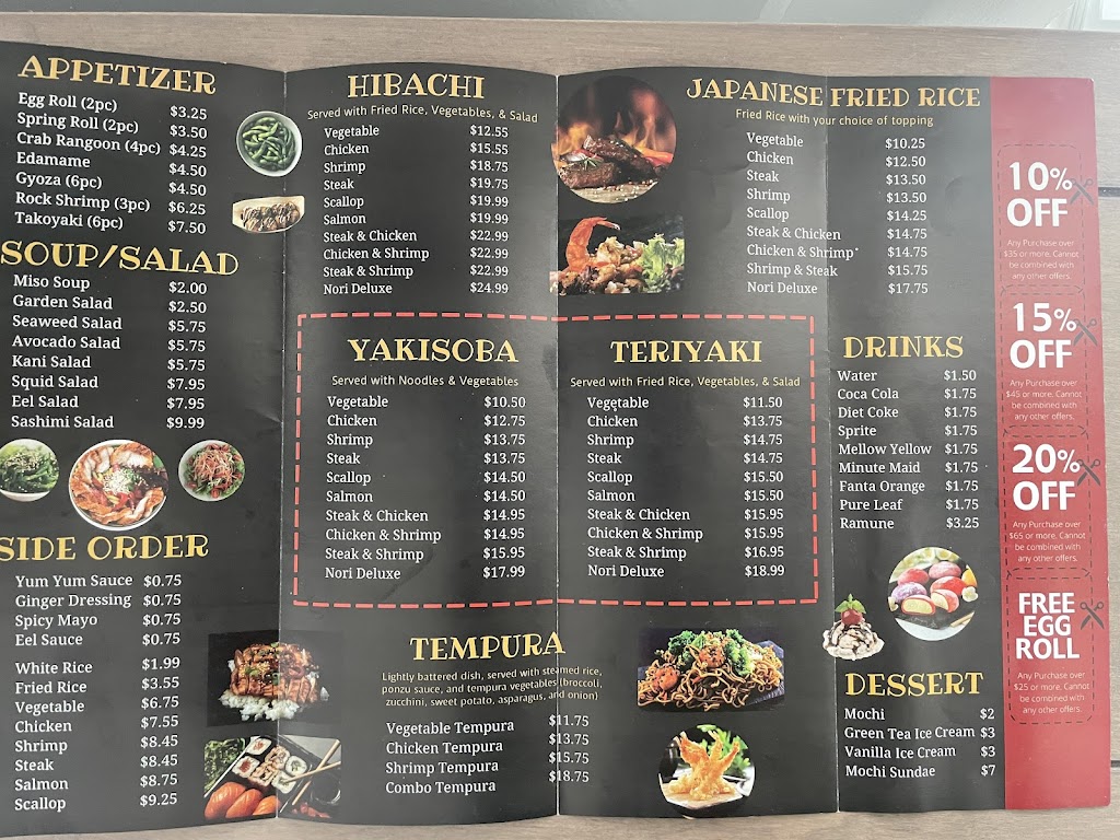 Our restaurant focus on serving the community with freshly prepared authentic sushi and hibachi. Sushi will be serve through build-your plate, along with made to order hibachi grill. Nori's mission is to deliver an ethnic Japanese cuisine by building an organization that is enriched by the modern culture and the cookery.