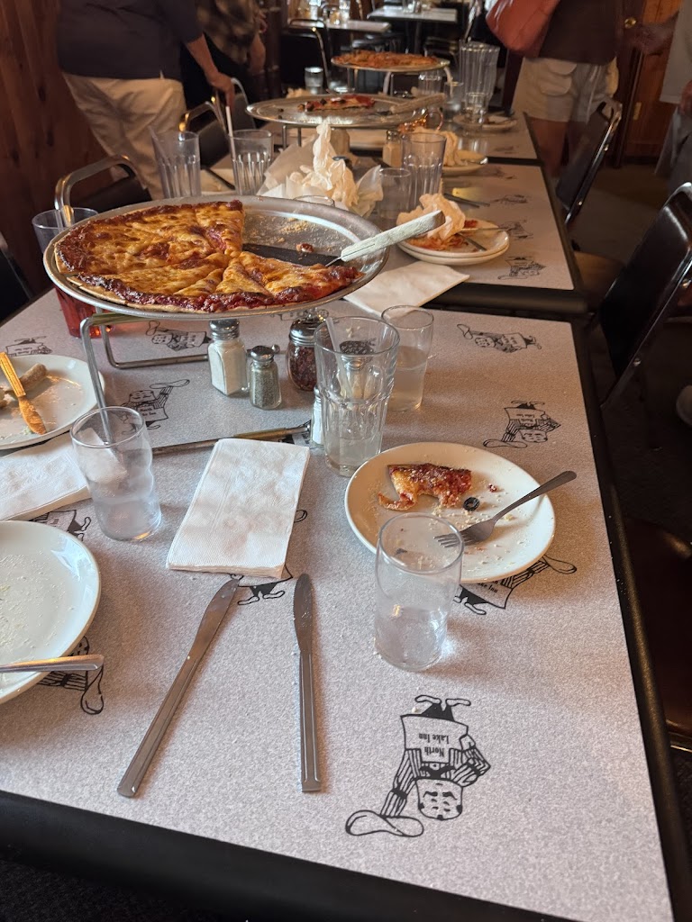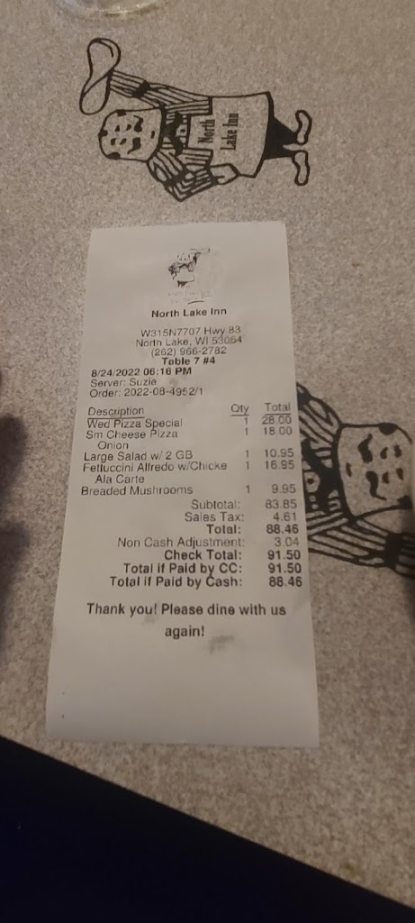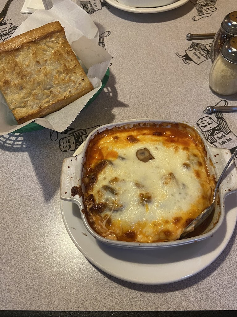 Excellent pizza and lasagna and there's spaghetti with meat sauce phenomenal we just love their garlic bread it is Brick style garlic bread it is tasty and delicious service with a smile never a long wait even if they tell you there's a half hour you can usually sit down at 10 to 15 minutes or enjoy a drink before you sit down for dinner North Lake has been there for better than 30 years that I know of I think they have the best pizza there is