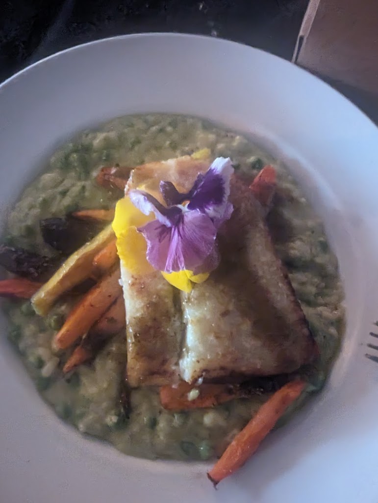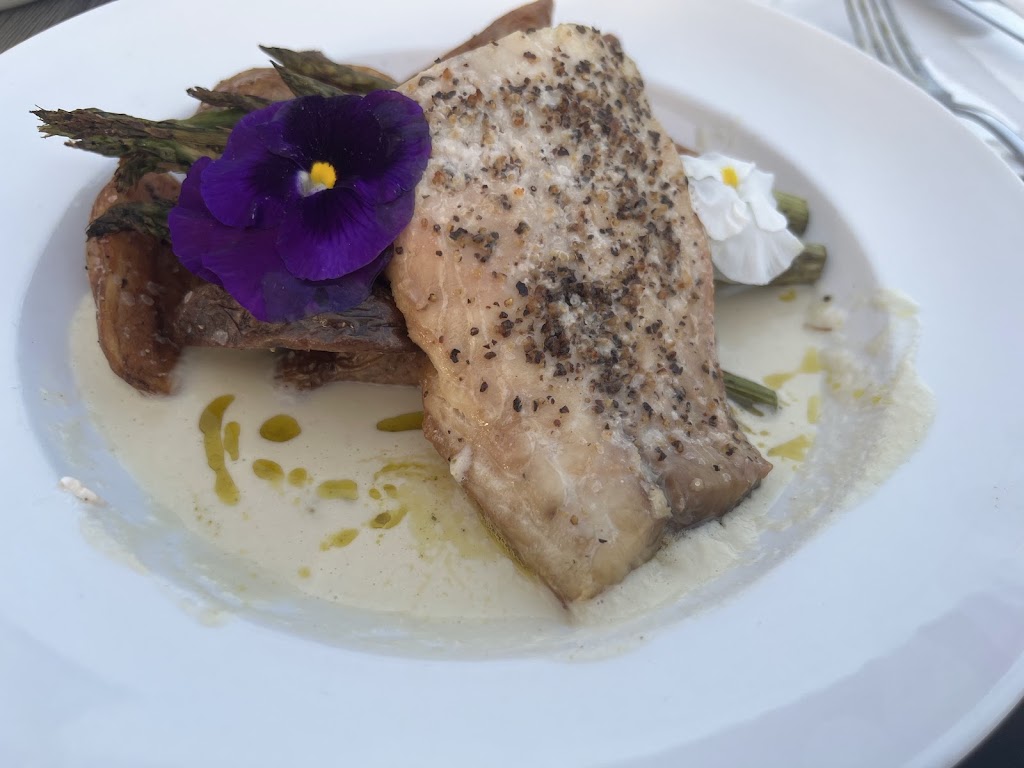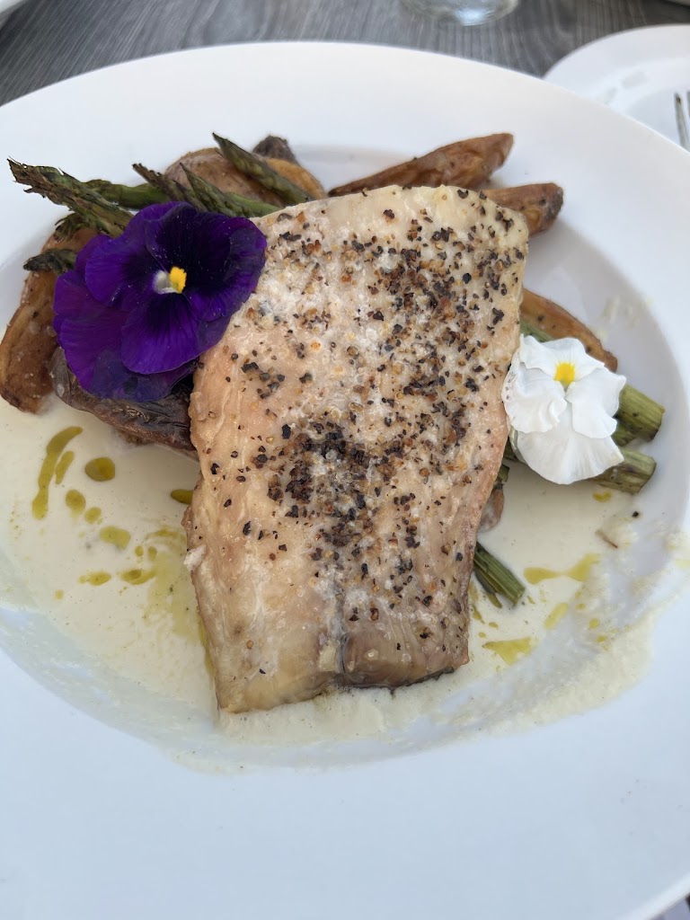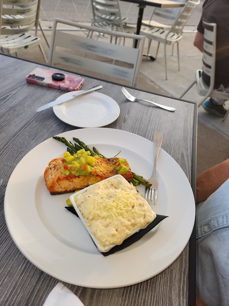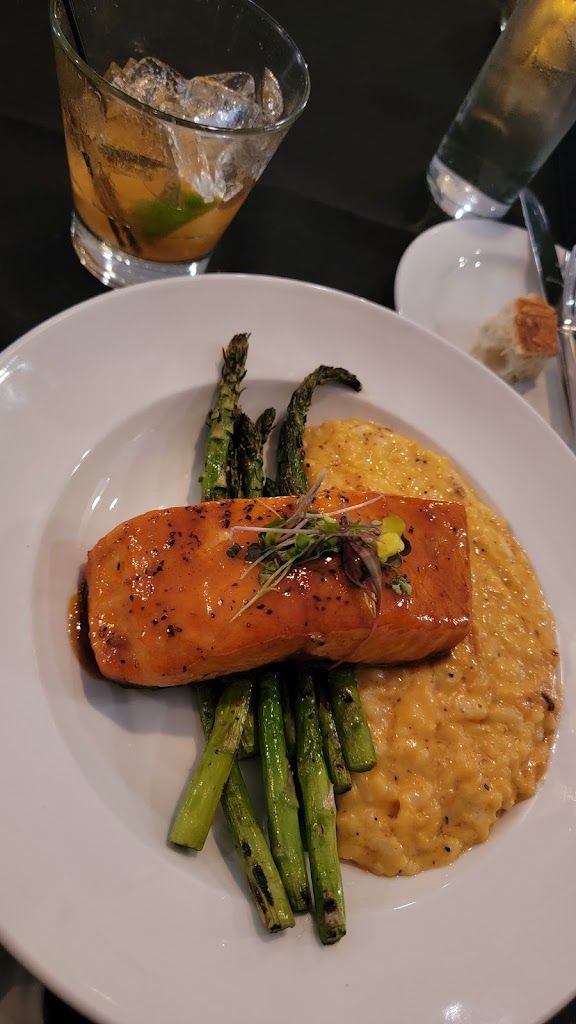 Both fish entrees were very good. The chutney on the salmon was an avocado pineapple blend with a touch of spice. Also excellent. My wife got risotto instead of the quinoa and then Asparagus as the veggie side.
