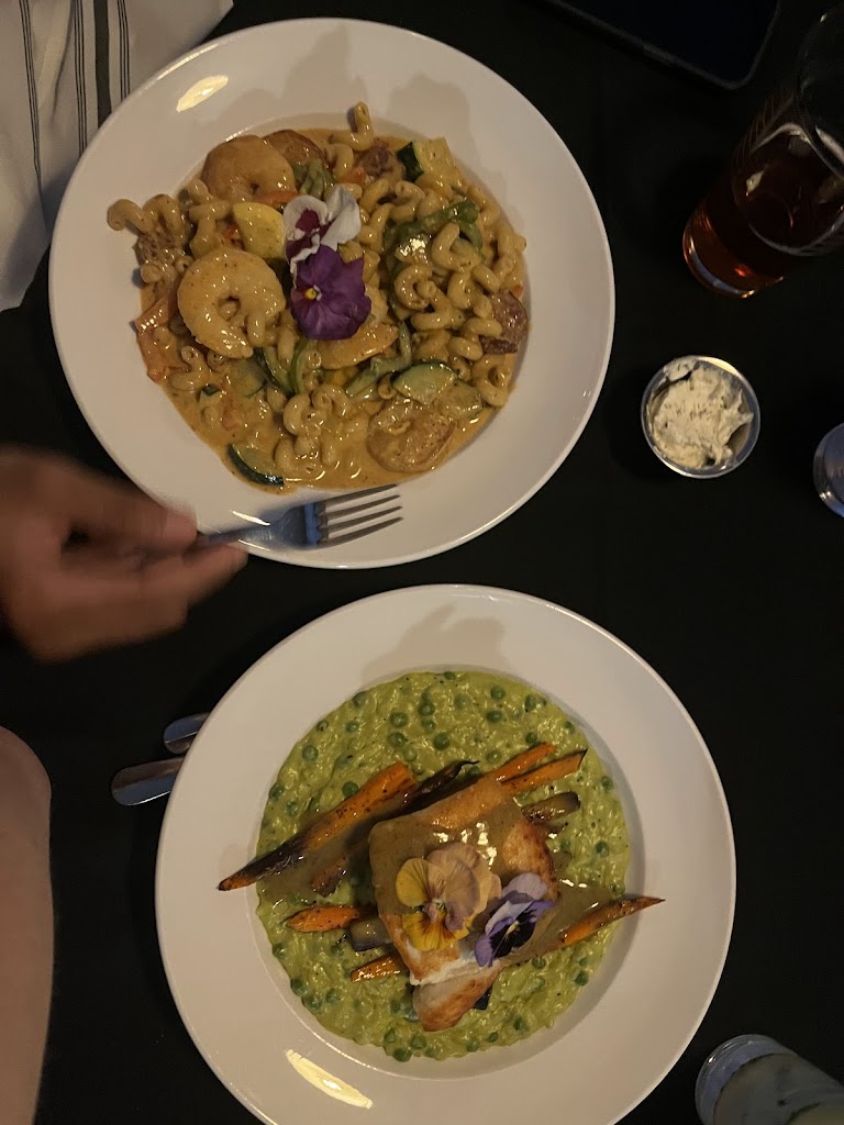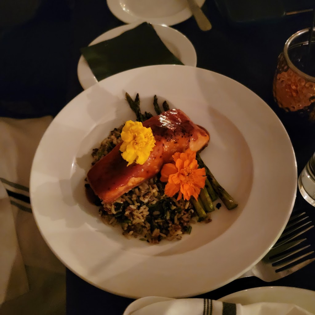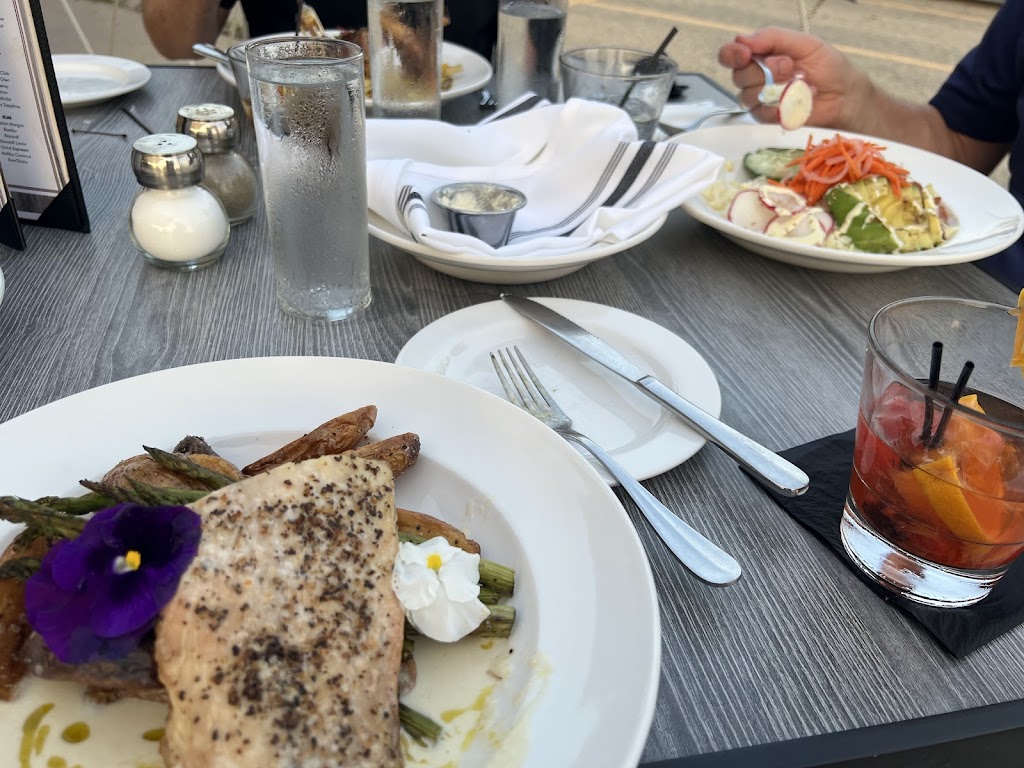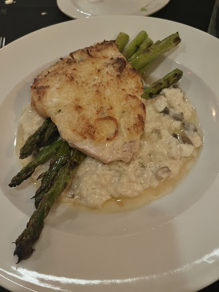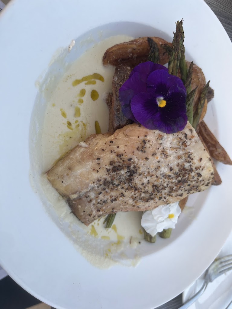 Both fish entrees were very good. The chutney on the salmon was an avocado pineapple blend with a touch of spice. Also excellent. My wife got risotto instead of the quinoa and then Asparagus as the veggie side.