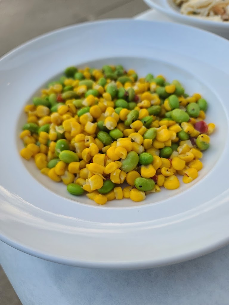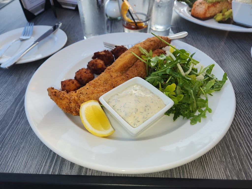 The food was excellent and not expensive either. Wonderful service from Hannah and Jenny. I had Pike perch which is like walleye, and my wife had the Salmon. Mine was the fish fry. Very nice tartar sauce and interesting arugula slaw. Crisp and hints of sweet and tart. The corn fritters were a little bland but hot and crispy on the outside. I also had the corn chowder, which was delicious. A hint of sweet with good mouthfeel and a little spice to finish. Nice.