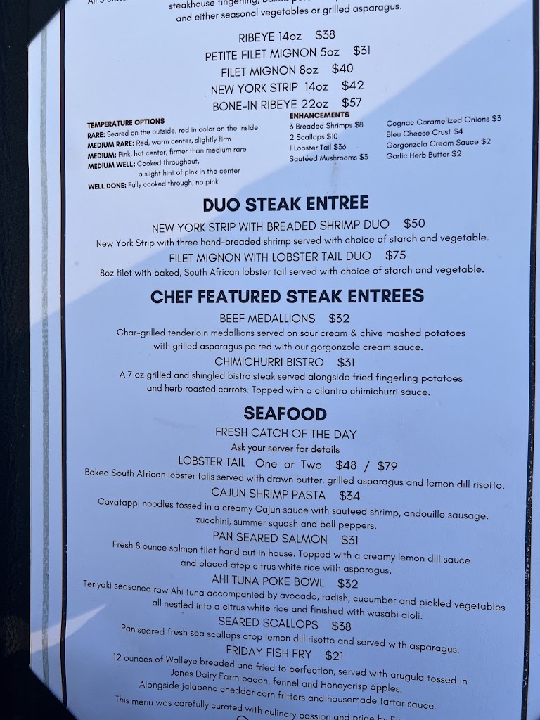First time here. Very impressed. Great food. Order the Bacon Slab if it’s on the menu for an appetizer. Wow!!! Service was great and very informative. Drinks were prepared proper. Will definitely be our favorite chophouse on the Kosh and in this area. Make sure you visit this place and bring your appetite.