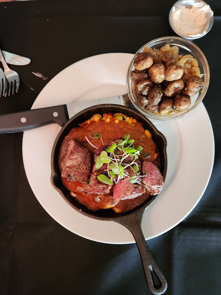 I had the steak feature, which was a Manhattan cut with a cherry reduction. Perfectly cooked and we'll seasoned! The brussel sprouts where amazing too! Stuffed Mushrooms were the best I've ever had! Great fresh bread service and the staff are so friendly :)