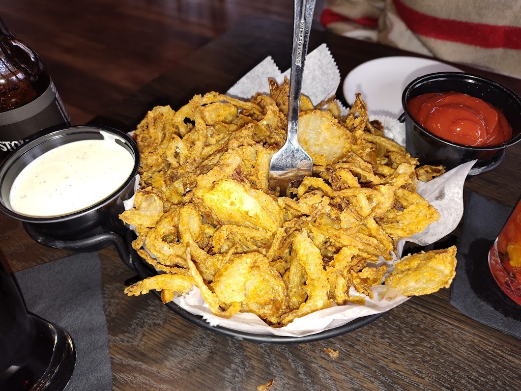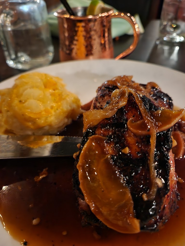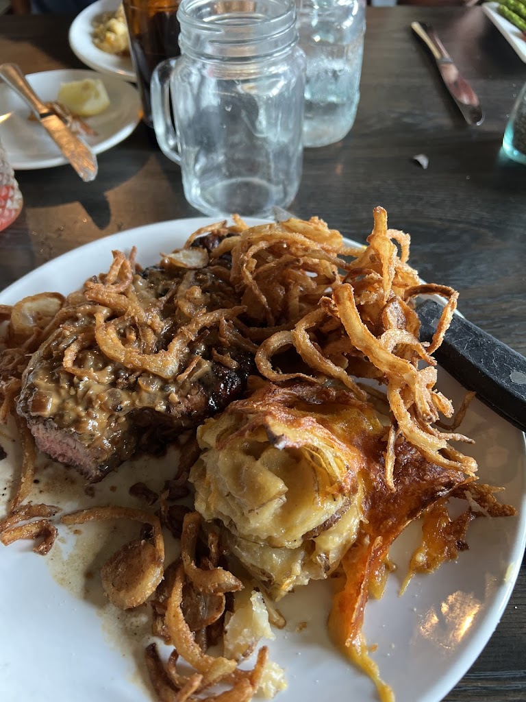 While there are numerous super clubs in the area and they all serve a really good filet, Northfork's filet stands at the top. Perfectly charred and seasoned, every last bite of the beef was packed with incredible flavor. My medium order was actually slightly overcooked and was medium-well, but it did not matter. It was juicy and tender (of course) and as flavorful a filet as I've ever had. Don't concern yourself with the fact that their 6 oz portion is priced the same as other restaurants' 8 oz portions, this is a case of quality over quantity. My wife ordered the Plantation filet which had the haystack onions included. Wow - nailed it! These were not the typical breaded and deep fried variety. These were fresh, sweet, with a dusting (NOT breaded), and piled HIGH. (See the photo.) Next time I want to try the porterhouse, and maybe include the grilled shrimp and grilled scallops add-ons (I saw a plate go by and they looked tremendous).