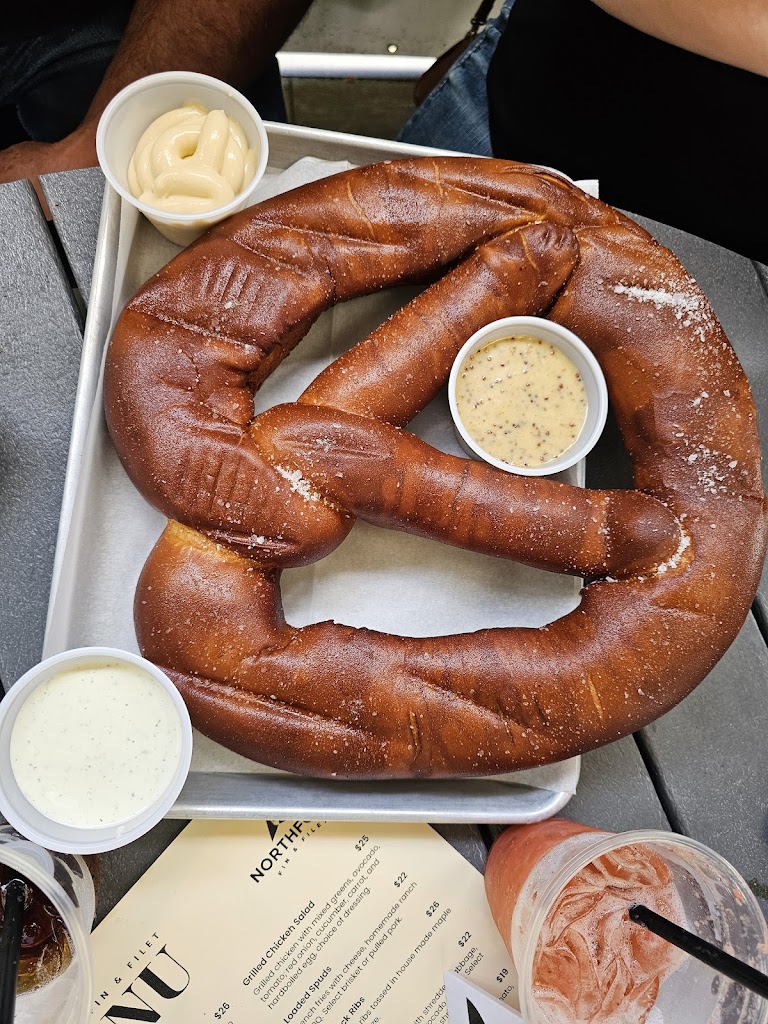 Ashley, our server was top notch! Our party of 4 all had steaks and every one came out perfect and delicious. The enormous soft pretzel, with 3 dippers, was an experience onto itself. Highly recommend. And, though we took them to go, the desserts were absolutely amazing the next day. (Not another bite would fit that night). Especially my coconut cake with roasted pineapple ice cream.