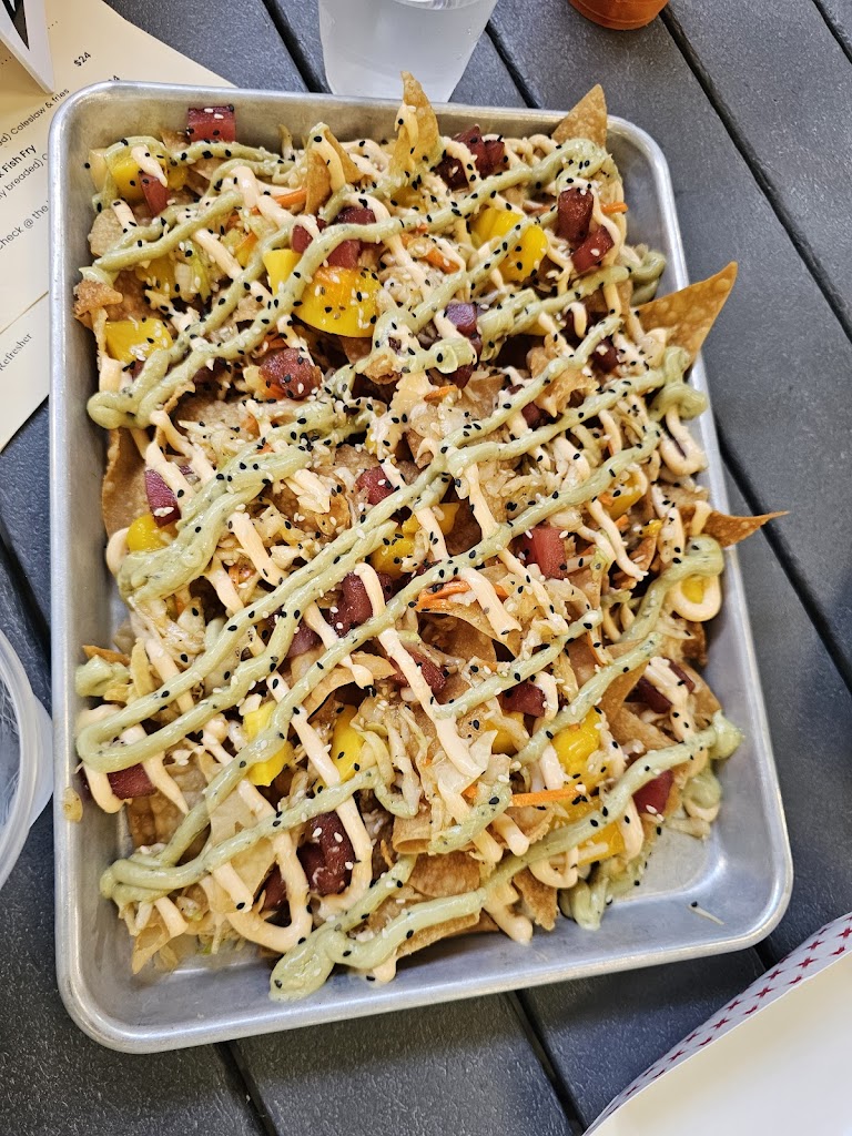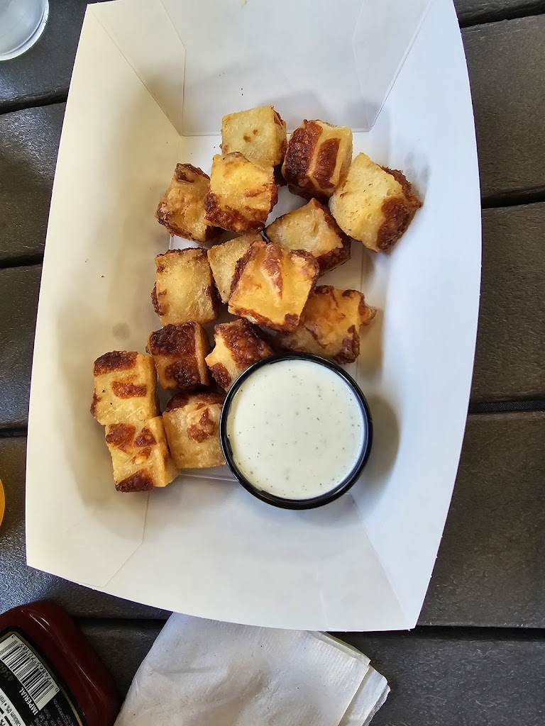 Excellent setting outdoors, tons of things to do for kids and adults. Ping pong, corn hole, etc. Plenty of seating, live entertainment. Wait staff was very friendly. Could use a bathroom outside, maybe a portable or something.