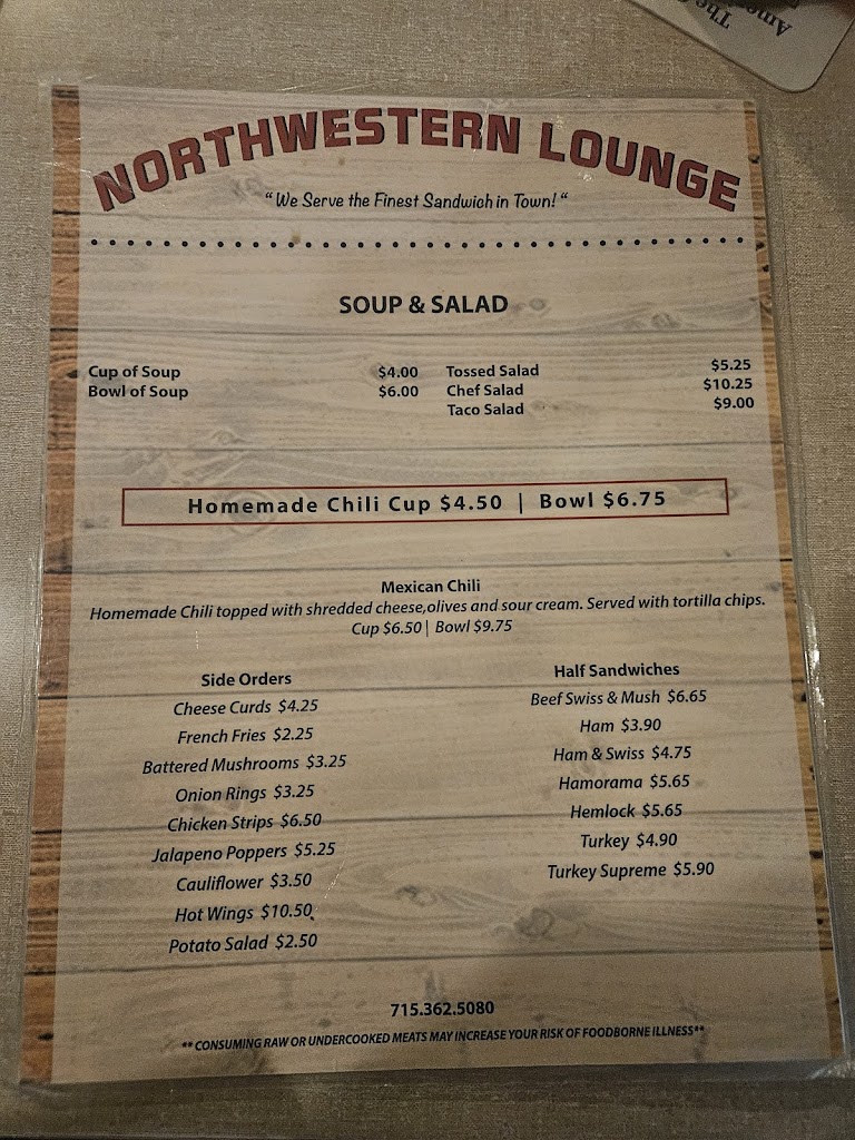 The Northwestern Hotel bar and restaurant is one of the best kept secrets in Rhinelander, WI! It is like walking back in time when you open the front door. They still serve the best sandwiches and homemade soups in town, and the prices are very reasonable.