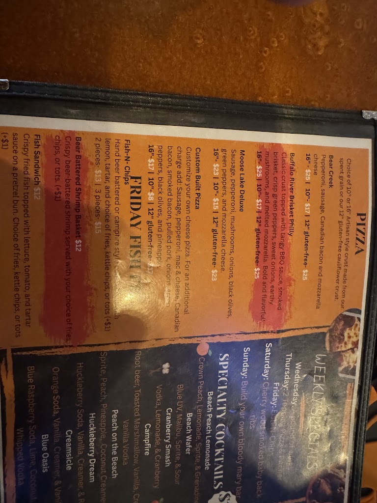 The ambiance is amazing. A northwoods lodge feel. A variety of beers on tap. The food is always great and the Bartenders are friendly. Sadly, they suffer the plight of most small businesses in keeping cooks and staff.