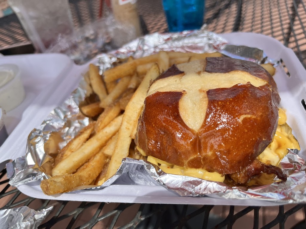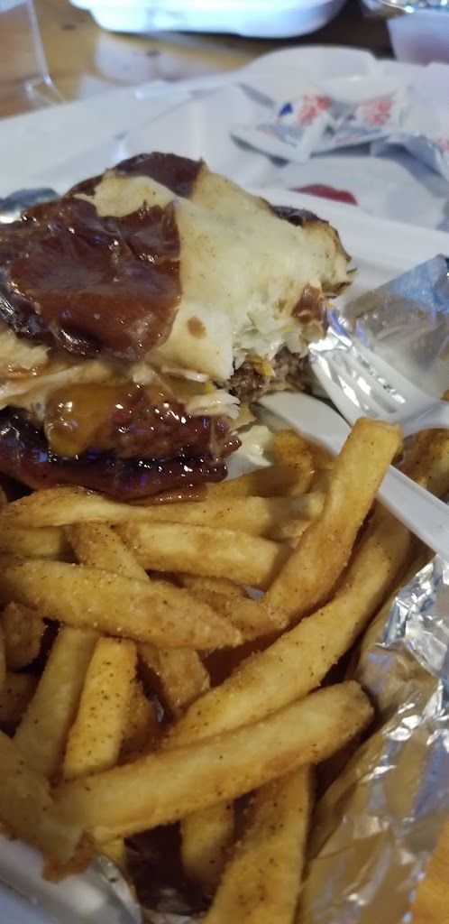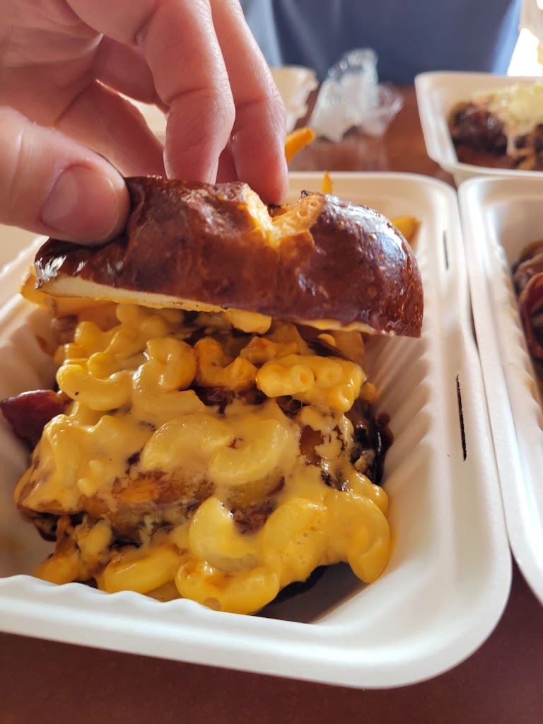 We came here for lunch and nobody liked their food other than the French fries and the cheese curds. Three of the four of us got the Bacon Mac & Cheese Burger sandwich and the fourth got the pulled pork sandwich. The BBQ sauce was super good on the mac and cheese burger. Burgers were unseasoned and dry. Mac and cheese was disappointing. Coleslaw wasn't coleslaw? It was dry and had zero flavor. The atmosphere is super cool tho and the people working here were nice. All the food came out in to-go containers even tho we were eating in? Silverware was to-go silverware. Super expensive as well for super disappointing food.